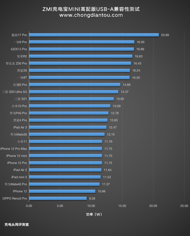 柱狀圖中魅族 17 Pro的功率最高,達(dá)到了 20.89W,其他設(shè)備均處于正常快充狀態(tài)。