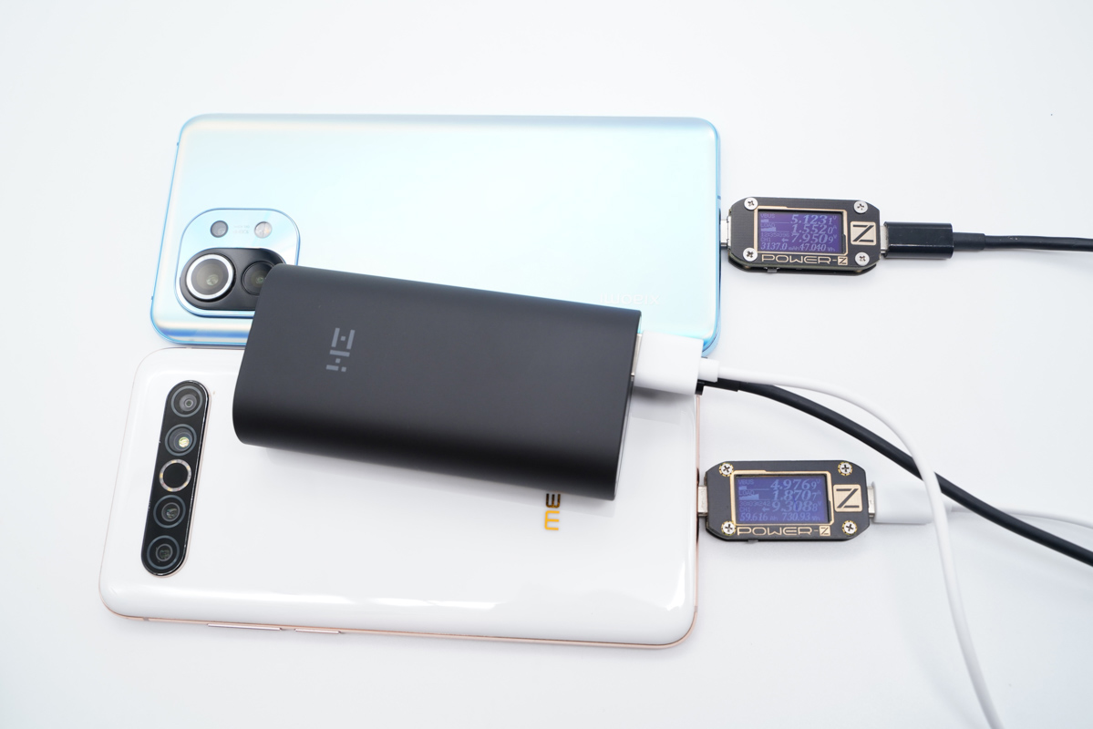 同時(shí)使用 2 個(gè) USB 接口為兩臺(tái)手機(jī)充電,功率分別為 7.95W 和 9.30W,充電寶支持 2 個(gè) USB 接口同時(shí)輸出且共享 5V3A 輸出。