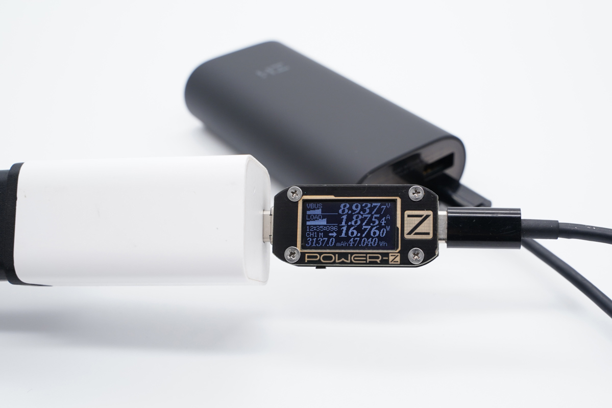 使用 PD 充電器通過(guò) USB-C 接口為充電寶充電,功率為 8.93V 1.87A 16.76W,充電寶支持快充輸入。