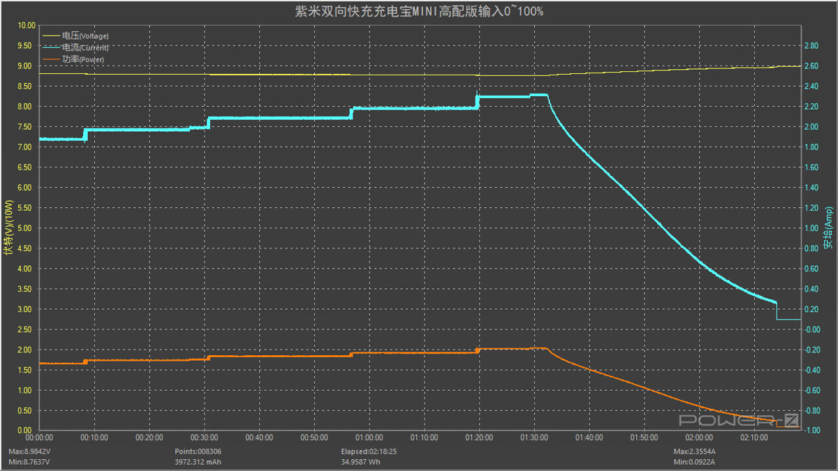 使用 PD 充電器為充電寶充電,整個(gè)過(guò)程可以看出是呈逐漸遞增趨勢(shì)的,1 小時(shí) 32 分后功率和電流逐漸下降直至充電結(jié)束,全程耗時(shí)約 2 小時(shí) 14 分,最高功率為 8.76V 2.32A 20.35W。