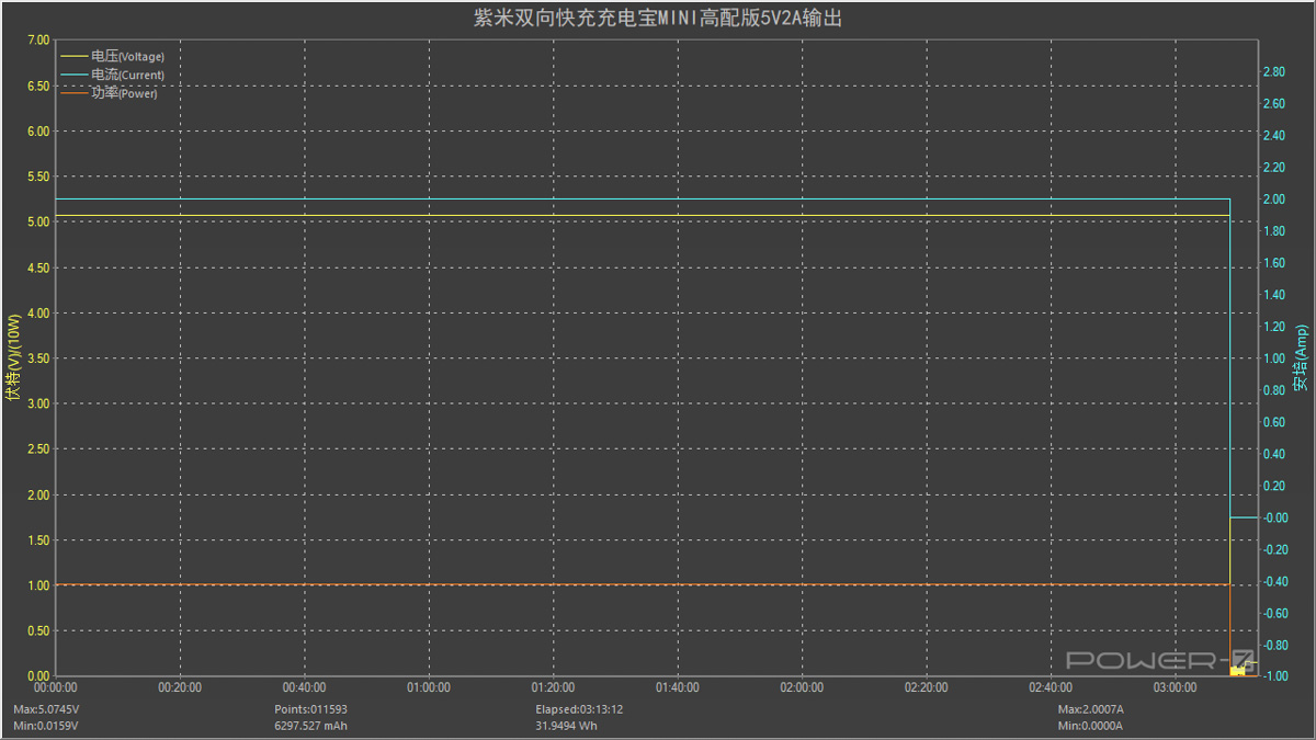 讓ZMI 紫米雙向快充充電寶 MINI 高配版以 5V2A 檔位輸出,全程耗時(shí)約 3 小時(shí) 08 分。放出的能量約為 31.9494Wh,所以充電寶在以 5V2A 檔位輸出時(shí)的效率約為31.9494/36.3=88.01% 。