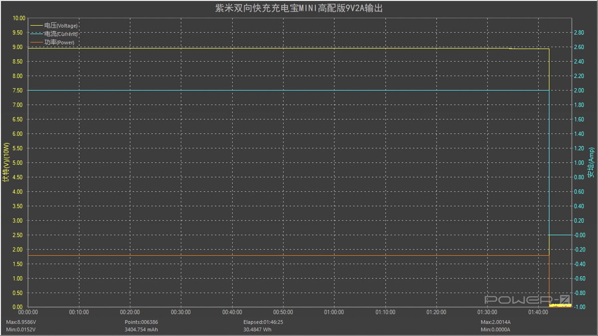 將電壓提升至 9V,讓ZMI 紫米雙向快充充電寶 MINI 高配版以 9V2A 檔位輸出,全程耗時(shí)約 1 小時(shí) 42 分。放出的能量約為 30.4847Wh,所以充電寶在以 9V2A 檔位輸出時(shí)的效率約為30.4847/36.3=83.97% 。