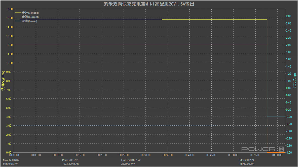?最后將功率提升至 15V2A 30W,讓 ZMI 紫米雙向快充充電寶 MINI 高配版以 15V2A 檔位輸出,全程耗時(shí)約 57 分。放出的能量約為 28.5903Wh,所以充電寶在以 20V1.5A 檔位輸出時(shí)的效率約為 28.5903/36.3=78.76% 。