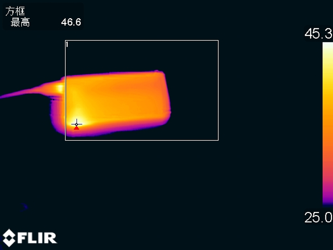 以 15V2A 檔位持續(xù)滿載輸出 1 小時(shí)后采集到充電寶表面的最高溫度為 46.4℃。
