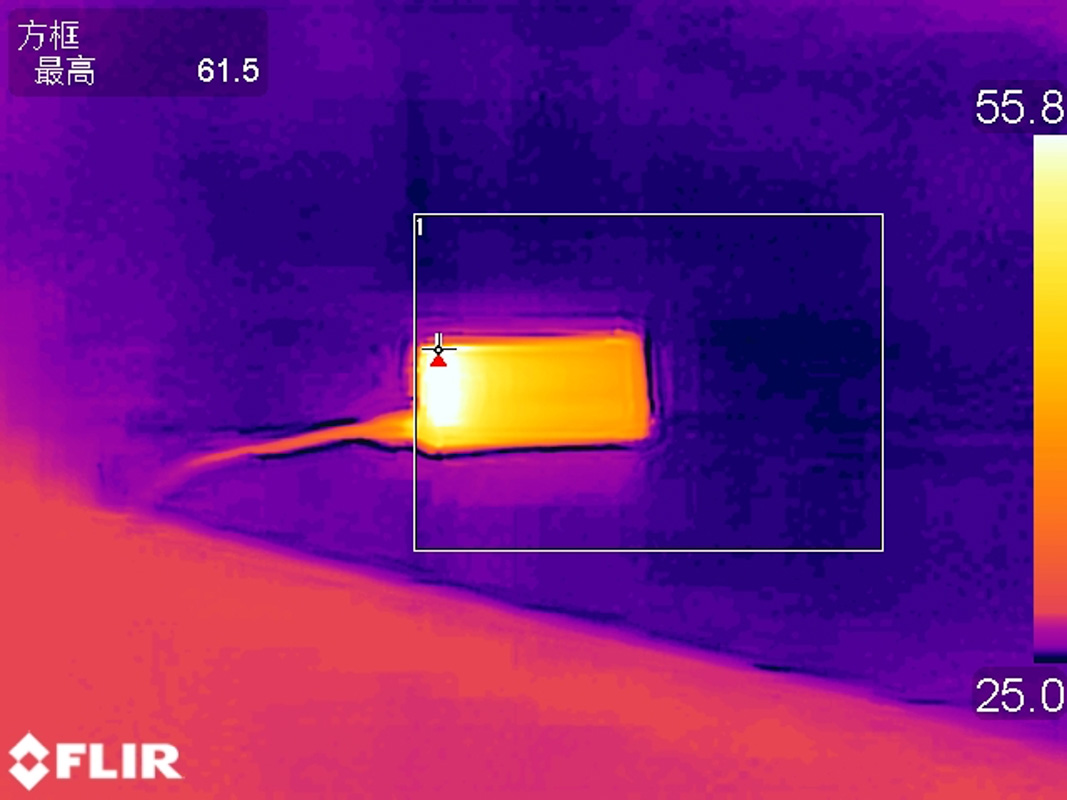 翻轉(zhuǎn)至另一側(cè),充電寶表面最高溫度為 61.5℃。