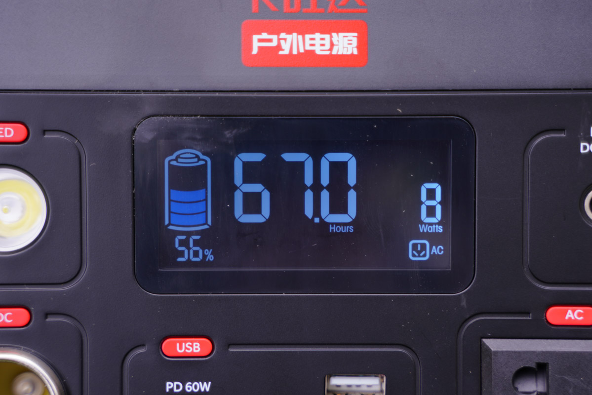 中間偏上的區域是自帶的數顯屏,在數顯屏中可以清楚的了解到戶外電源此時的剩余電量、AC或USB或DC接口是否已經通電,以及充電的功率等等,并且還可以了解到在不同的使用狀態下預計可用的時長,方便用戶隨時判斷電量狀態。