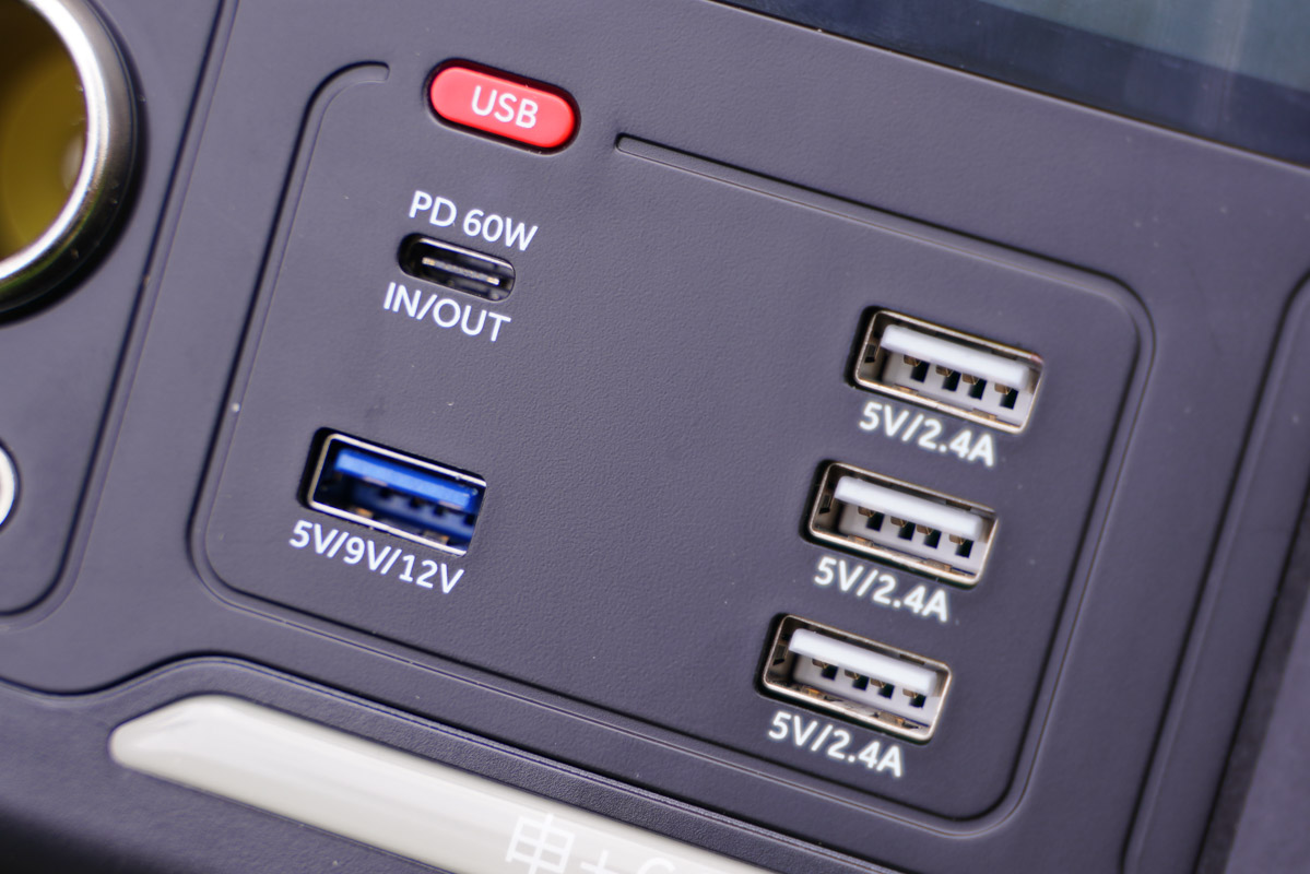 輸出方面,220Vac支持600W正弦波輸出,車充和DC輸出接口支持12-16.8V 10A輸出,USB-A(白色)支持5V2.4A快充,藍色支持18W快充,USB-C則支持60W雙向PD快充。