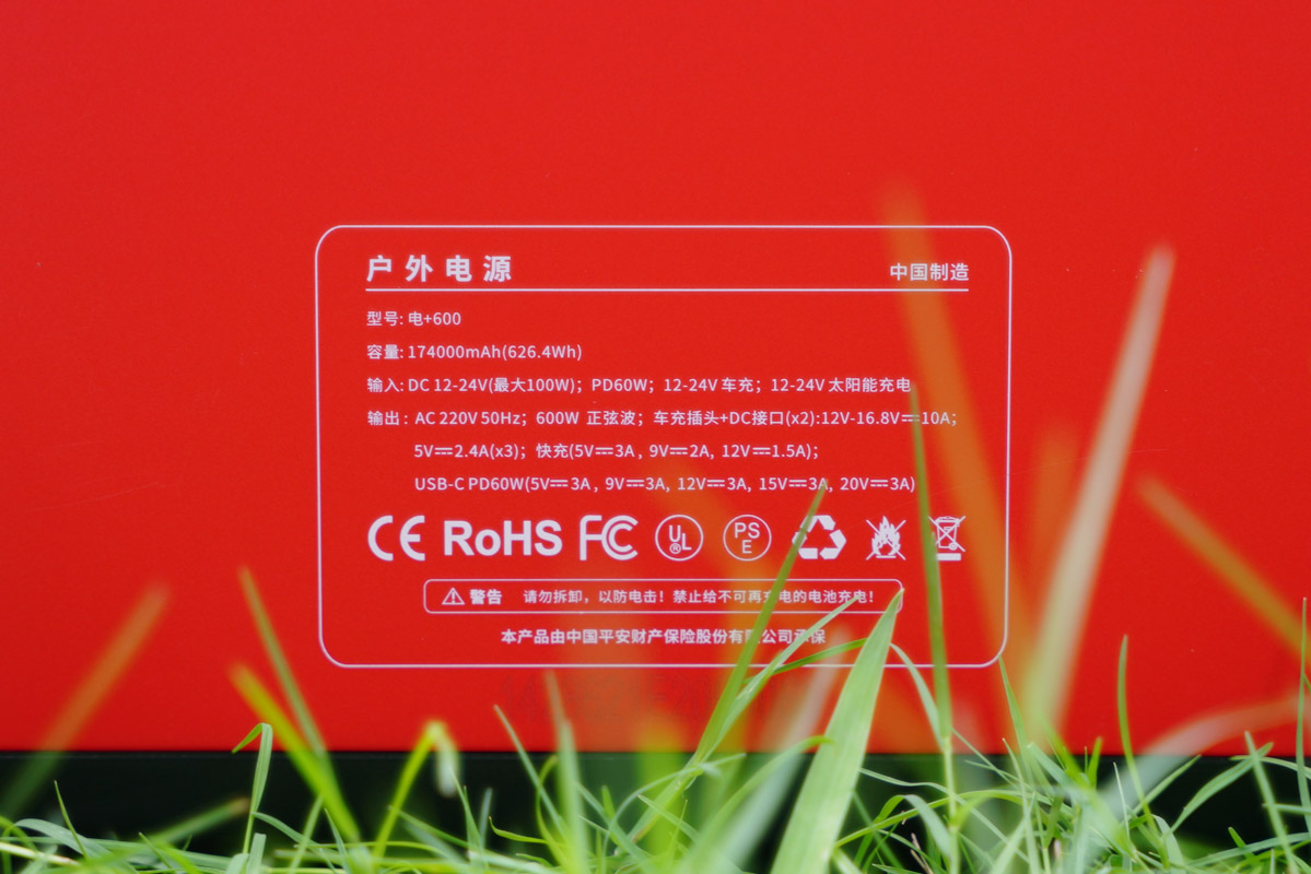 最后來看一下參數,這款戶外電源的具體型號為電+600,電池能量為626.4Wh,174000mAh。自充方面支持100W的DC輸入、60W的PD輸入,12-24V的車充輸入和太陽能充電。
