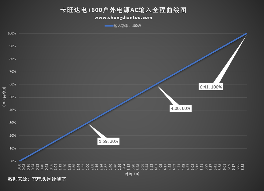 此次還使用功率計采集了使用原裝充電器輸入的全程,從曲線圖中可以得知,原裝充電器為卡旺達電+600戶外電源1小時59分充電30%,4小時充電60%,完全充滿需要6小時41分左右。