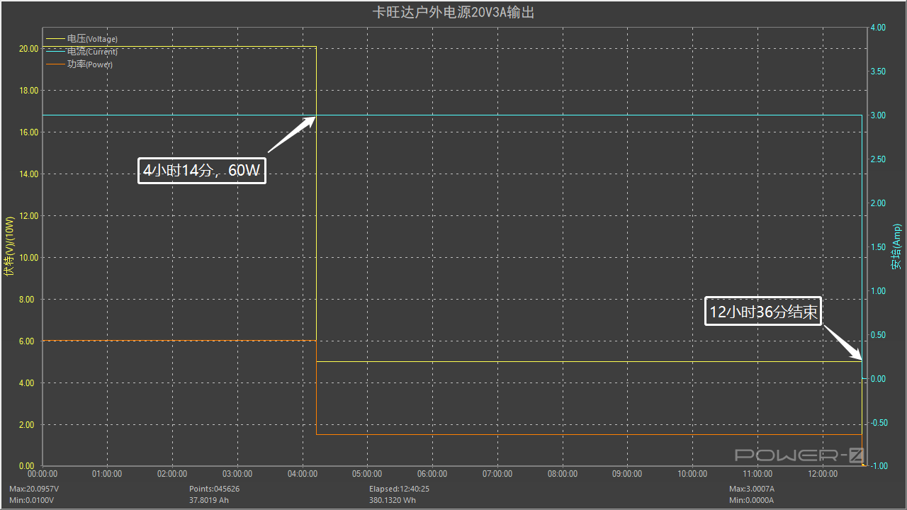 這里還測試了讓卡旺達戶外電源的USB-C接口以20V3A持續輸出,在4小時14分時降至5V3A輸出,于12小時36分結束。