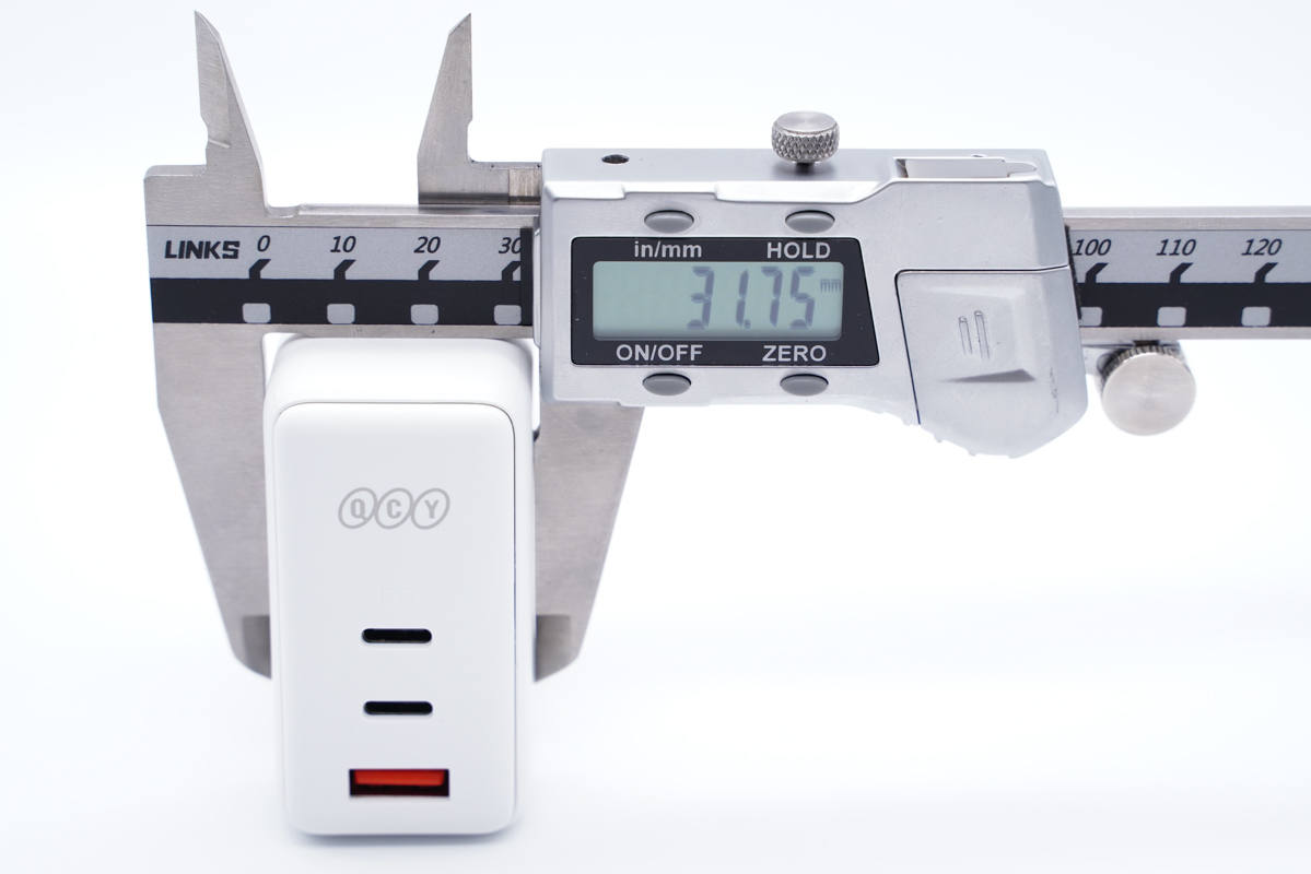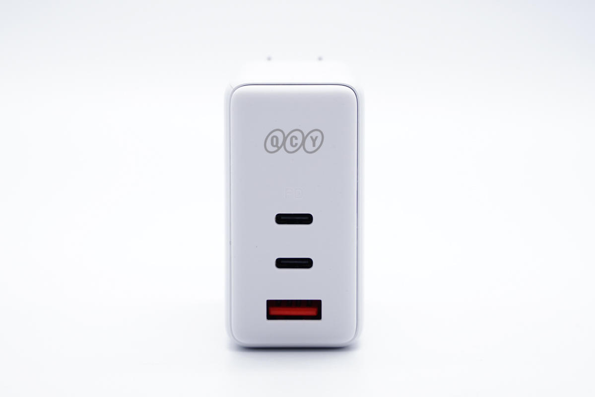 輸出頂面配有2C1A三個(gè)USB接口,分別為紅色和黑色膠芯。此外外殼上印有QCY品牌logo。