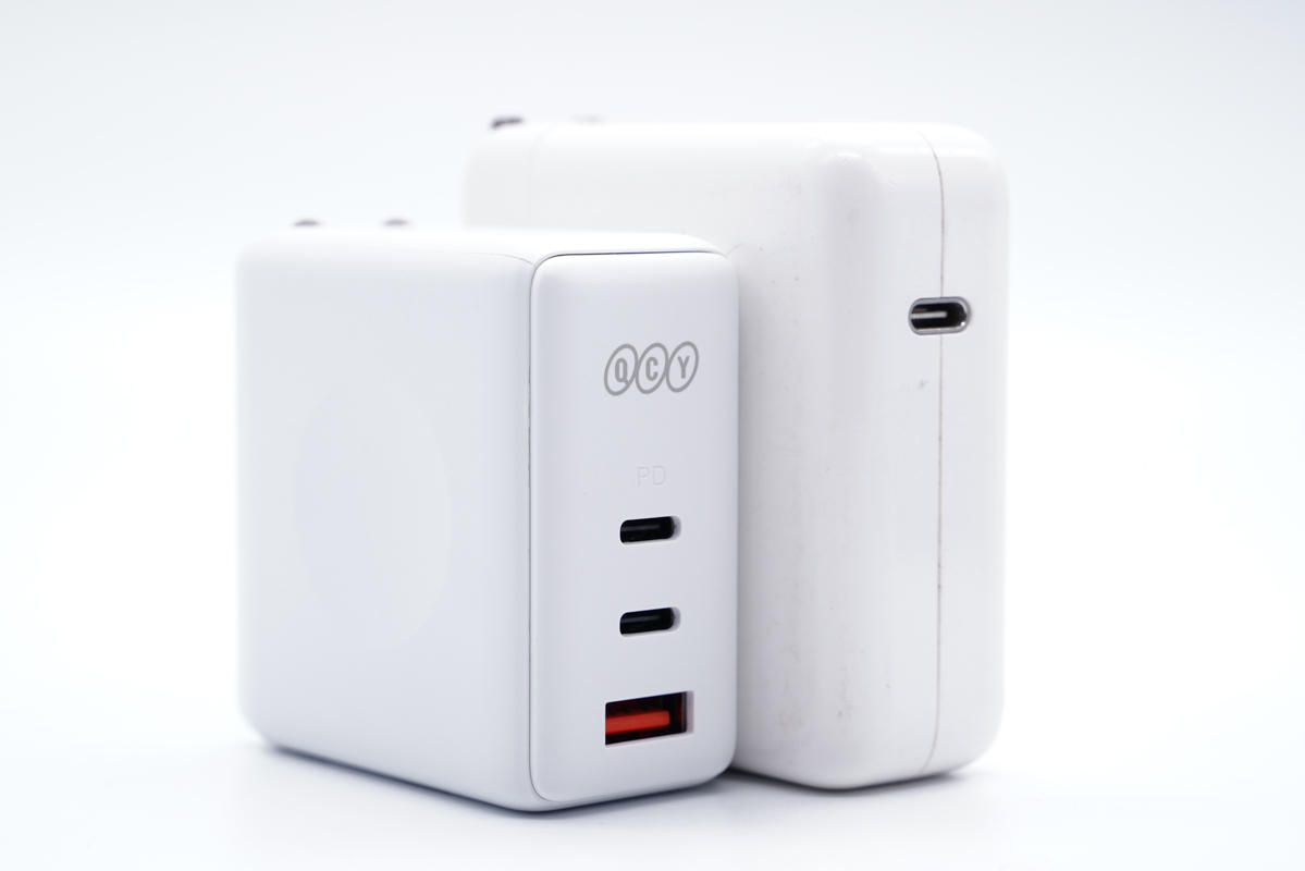 和蘋(píng)果61W充電器直觀對(duì)比,體積優(yōu)勢(shì)明顯。