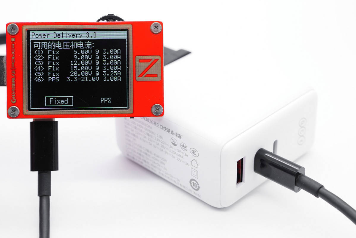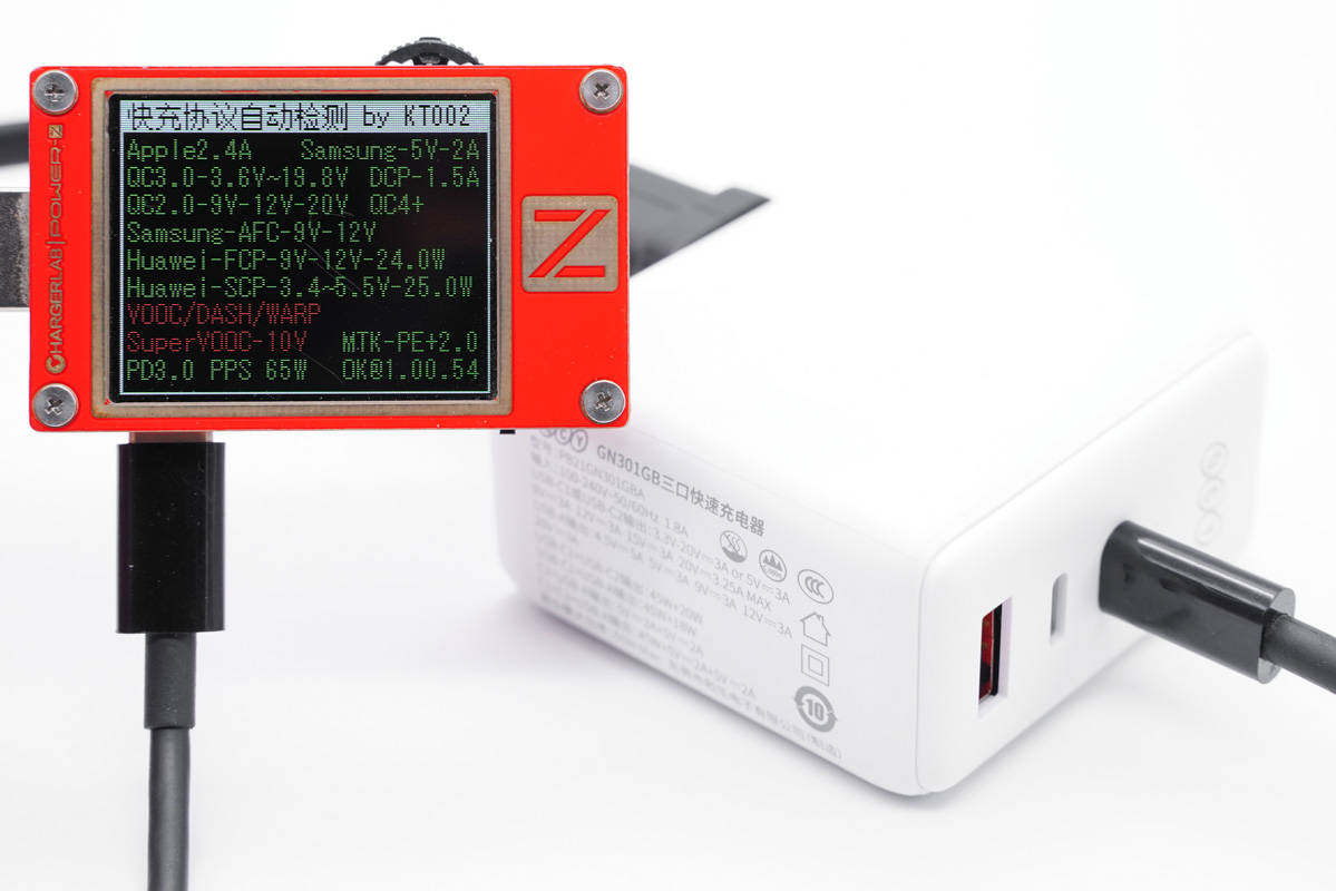使用ChargerLAB POWER-Z KT002測(cè)得USB-C1口支持Apple 2.4A、Samsung 5V2A、DCP協(xié)議,以及QC2.0/3.0、AFC、FCP、SCP、PE2.0、PD3.0、PPS多個(gè)快充協(xié)議。
