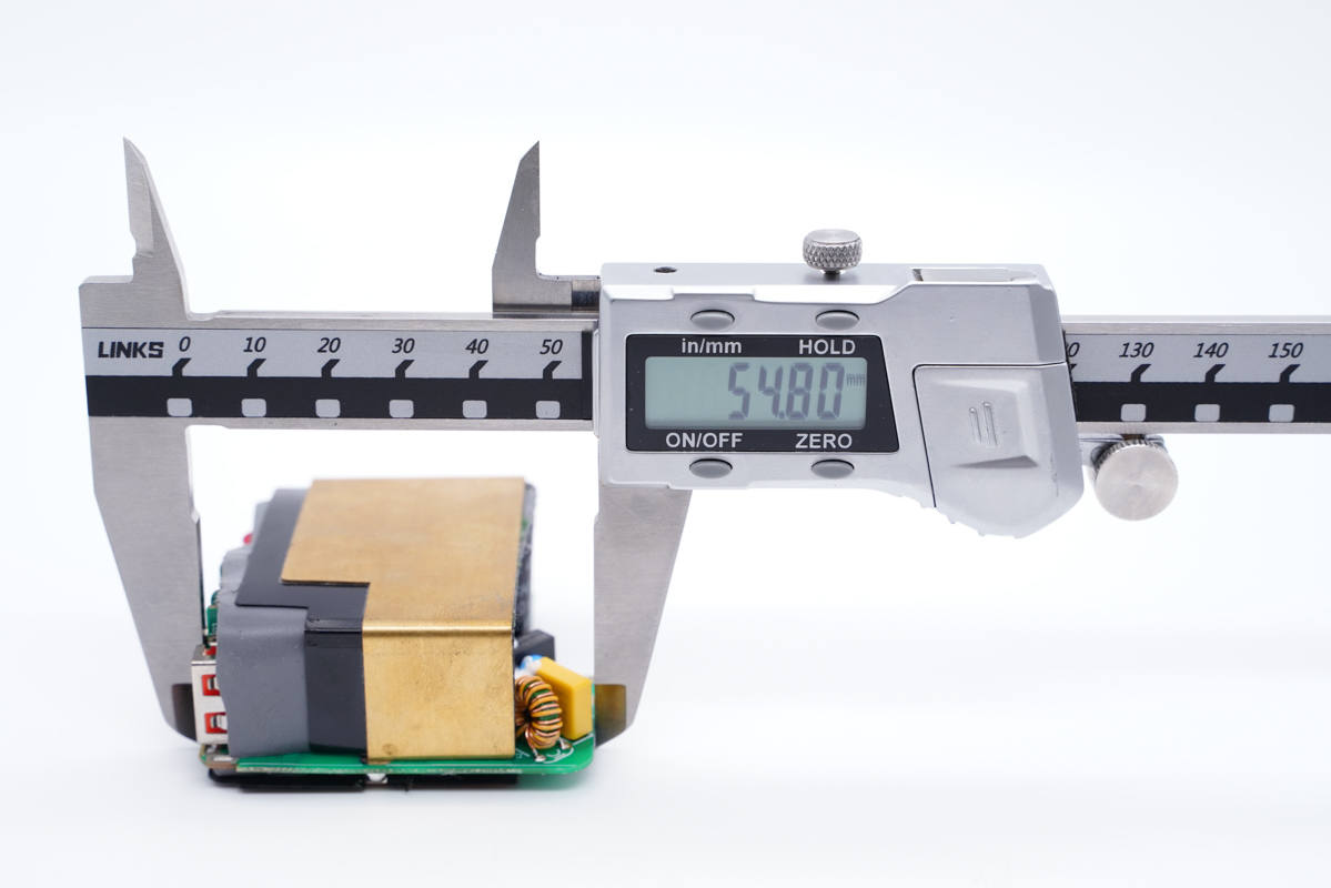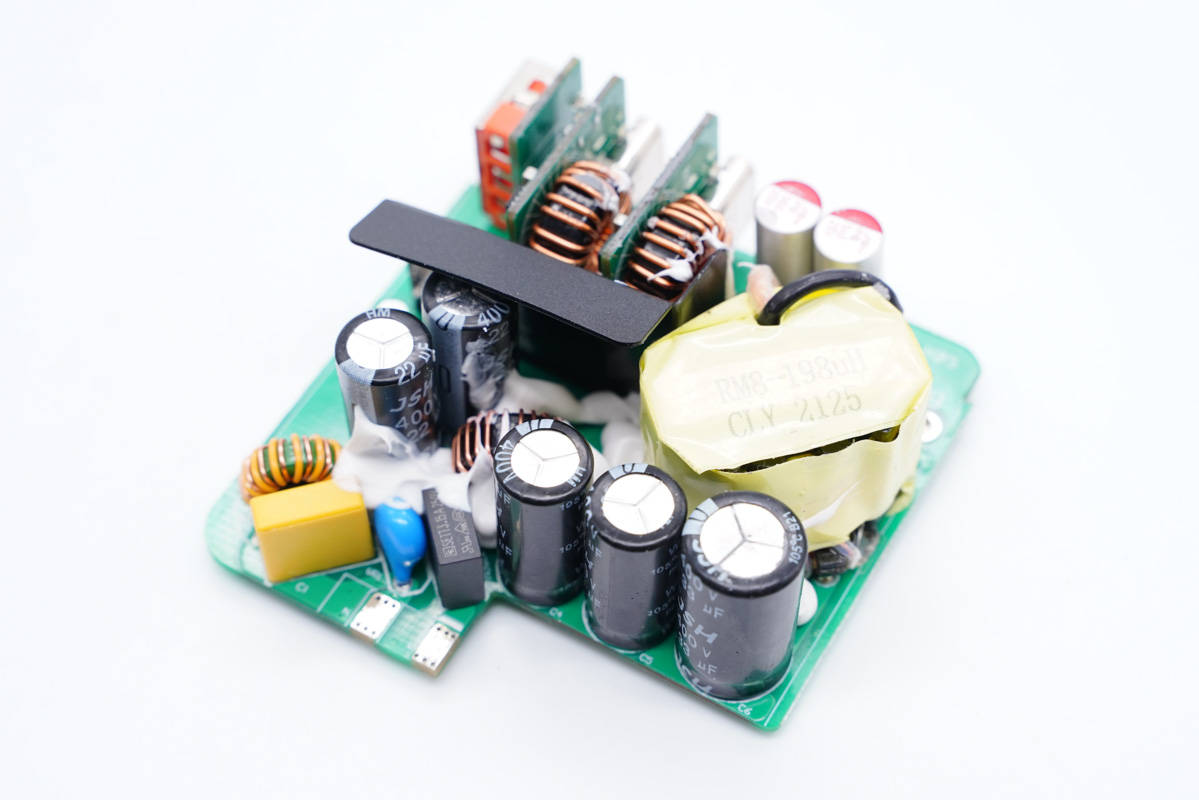 輸出端一覽,三個(gè)USB母座均焊接在小板上,左側(cè)還有兩顆濾波固態(tài)電容。