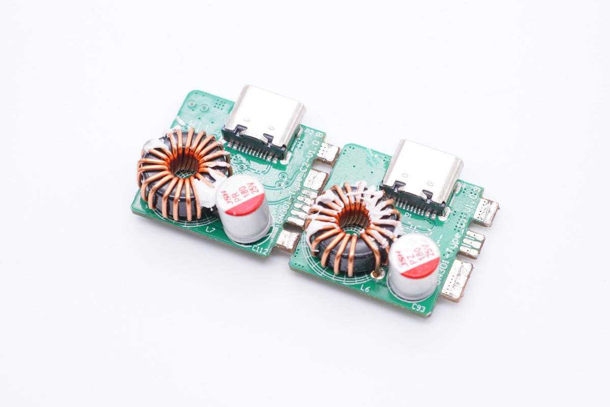兩個(gè)C口母座所在小板設(shè)計(jì)完全相同,正面設(shè)有降壓電感和濾波電容。