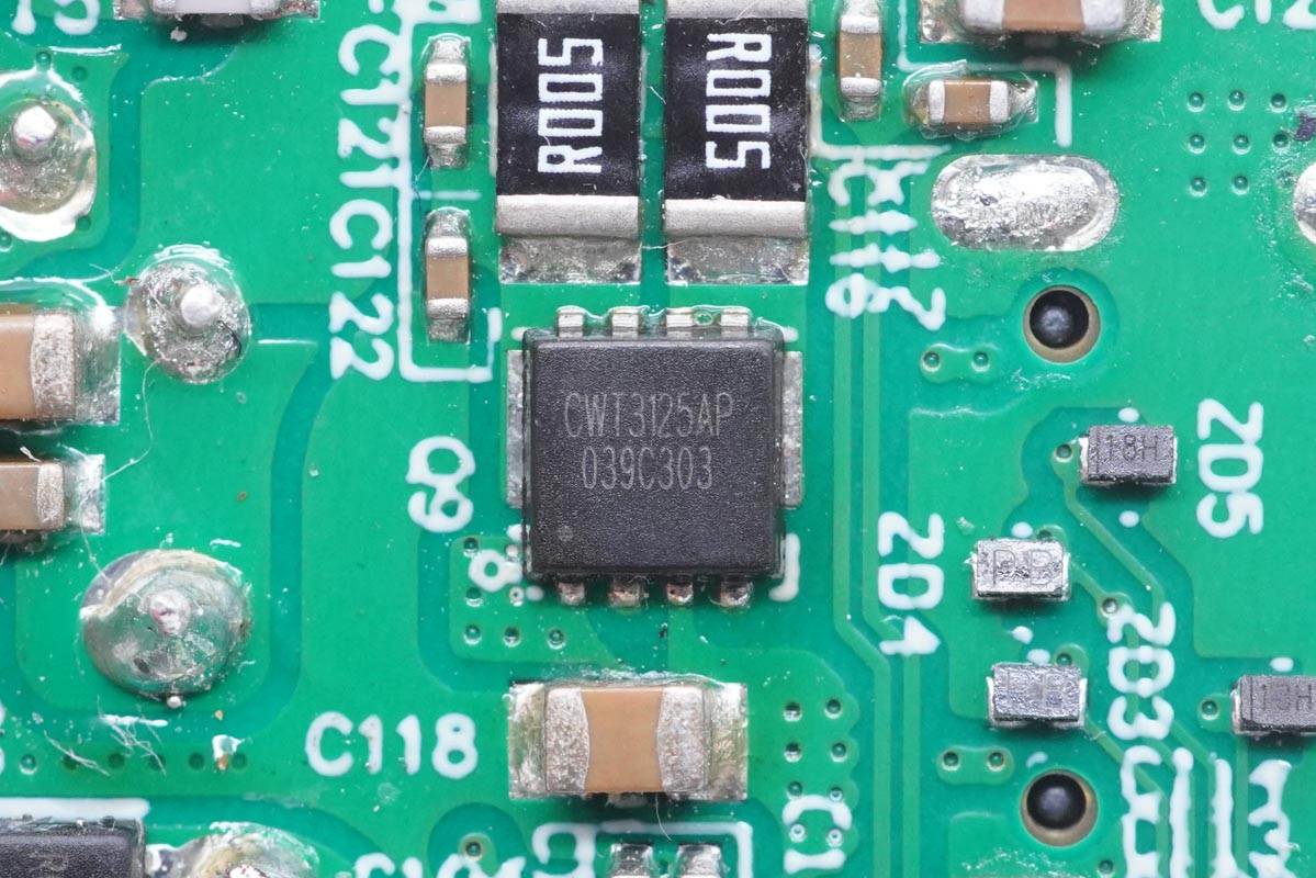 輸出VBUS開(kāi)關(guān)管特寫(xiě),絲印CWT3125AP,雙NMOS,負(fù)責(zé)USB-A口和USB-C口。