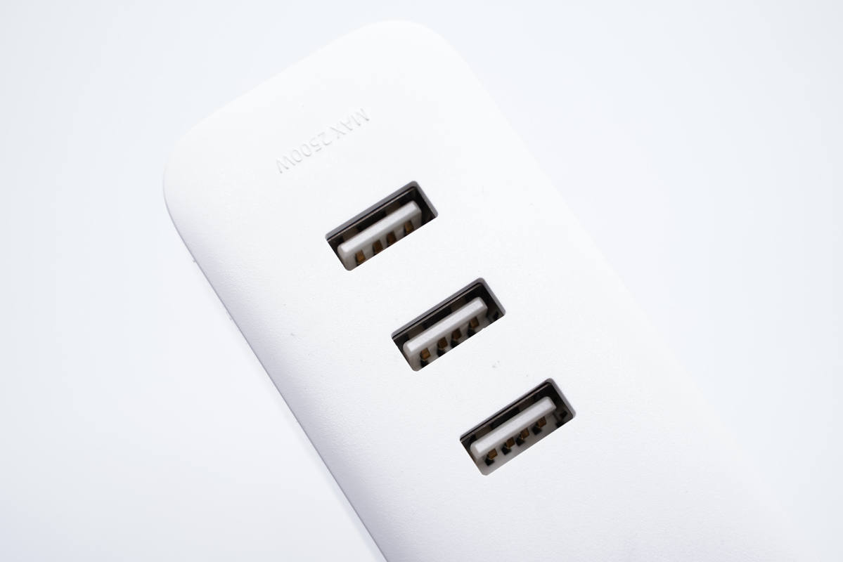 端部設(shè)有三個(gè)USB接口,采用白色膠芯。接口旁有MAX 2500W字樣,表明最大功率。