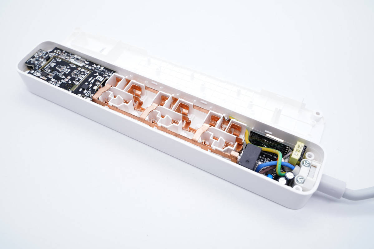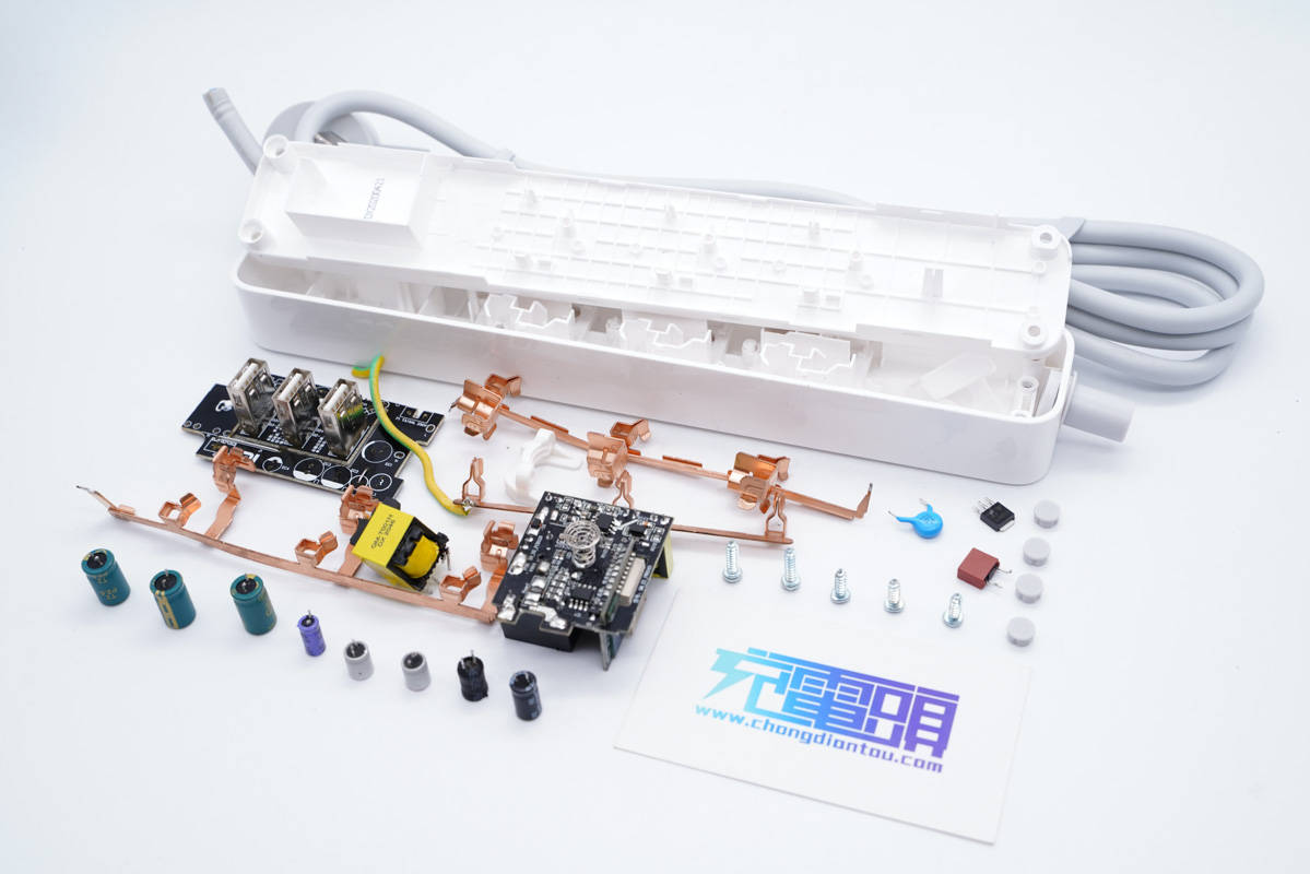 這款產(chǎn)品配備了3個(gè)3+2插孔和三個(gè)USB接口,其中每個(gè)USB接口都支持5V2.1A輸出,總輸出15W,再加上插座的3個(gè)AC插口,可同時(shí)為6臺(tái)設(shè)備供電,最大承載功率2500W。目前這款插座已經(jīng)上架小米有品商城,售價(jià)99元。下面充電頭網(wǎng)將對(duì)這款產(chǎn)品進(jìn)行拆解,看看其設(shè)計(jì)做工如何。