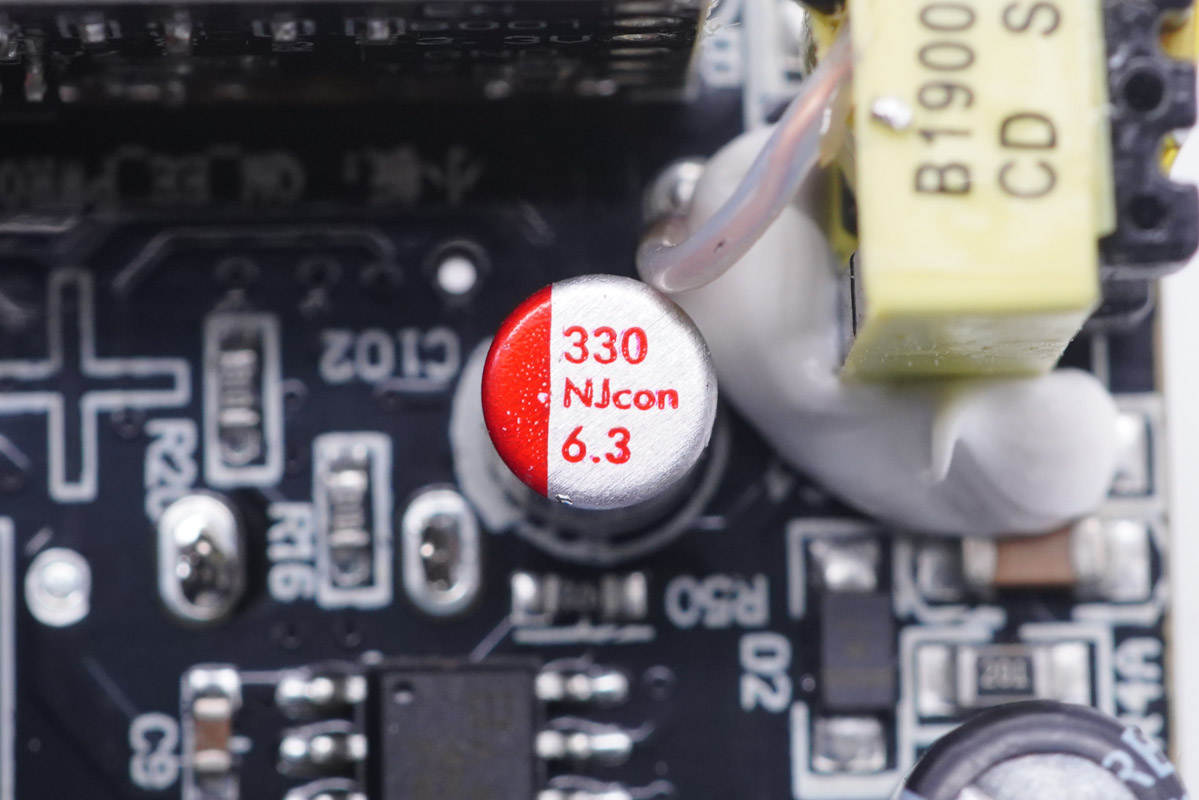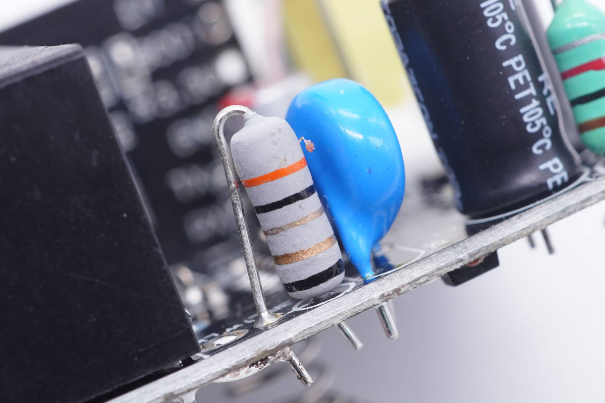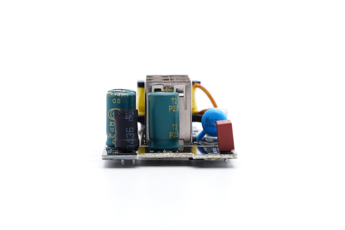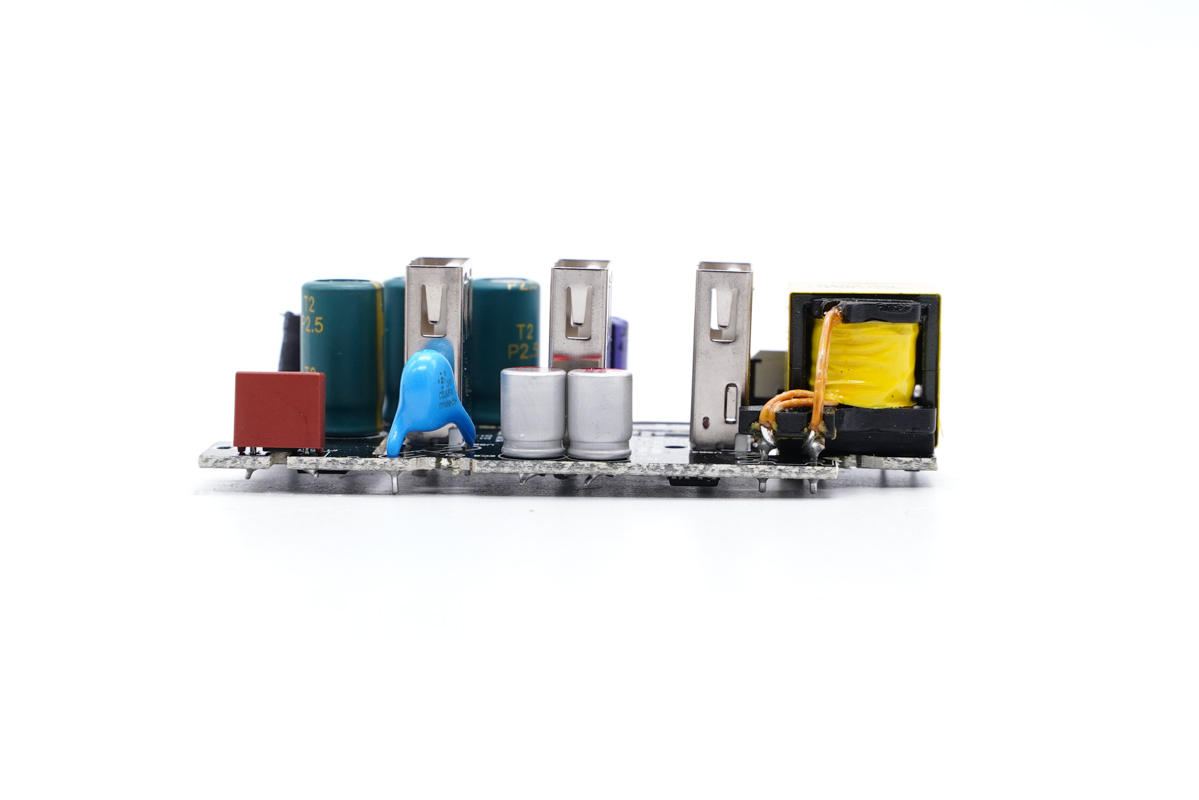 PCB板另一側(cè)一覽,設(shè)有Y電容以及兩顆濾波固態(tài)電容。