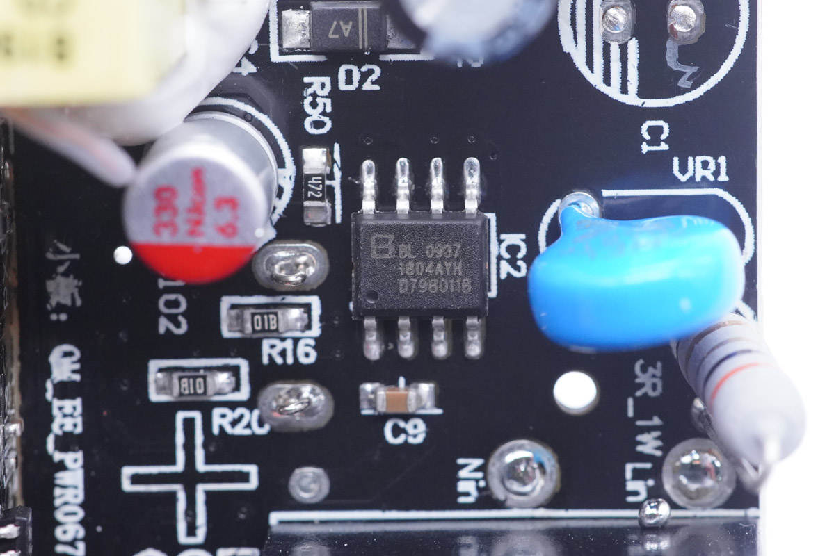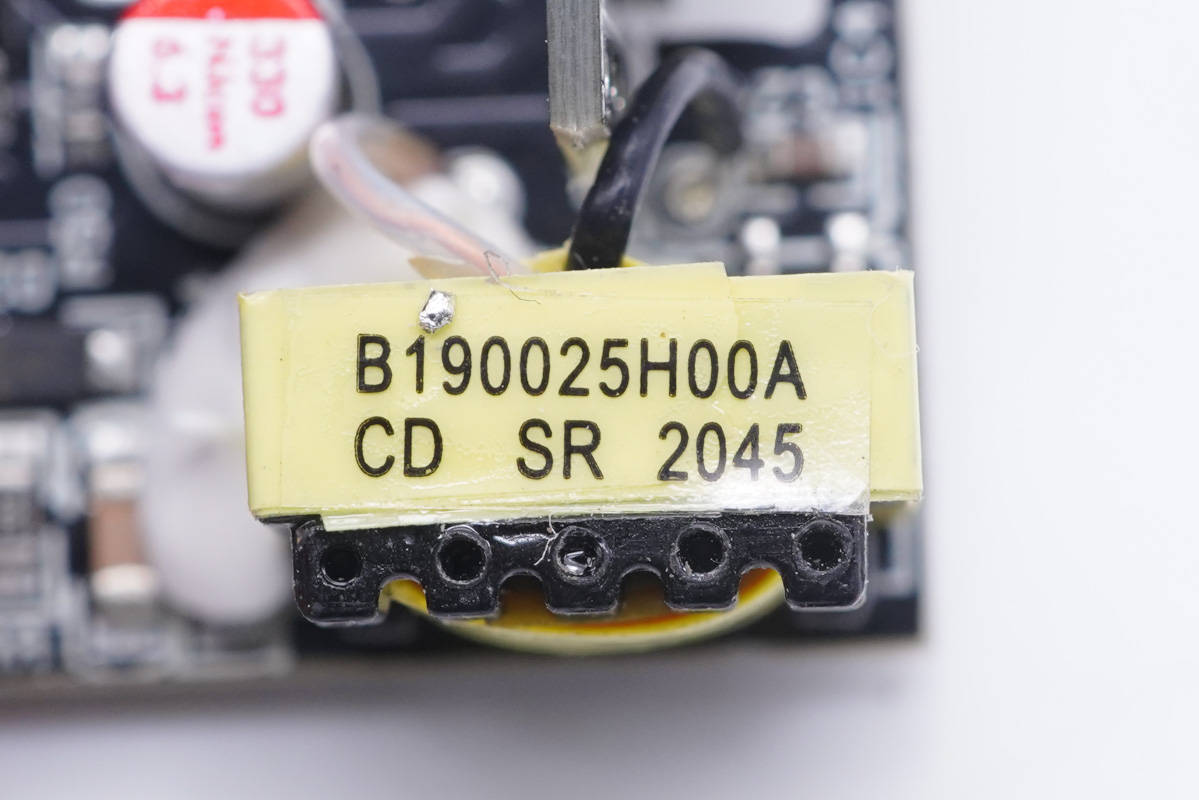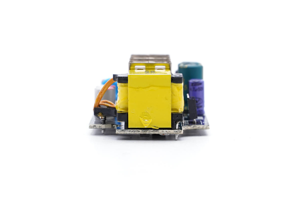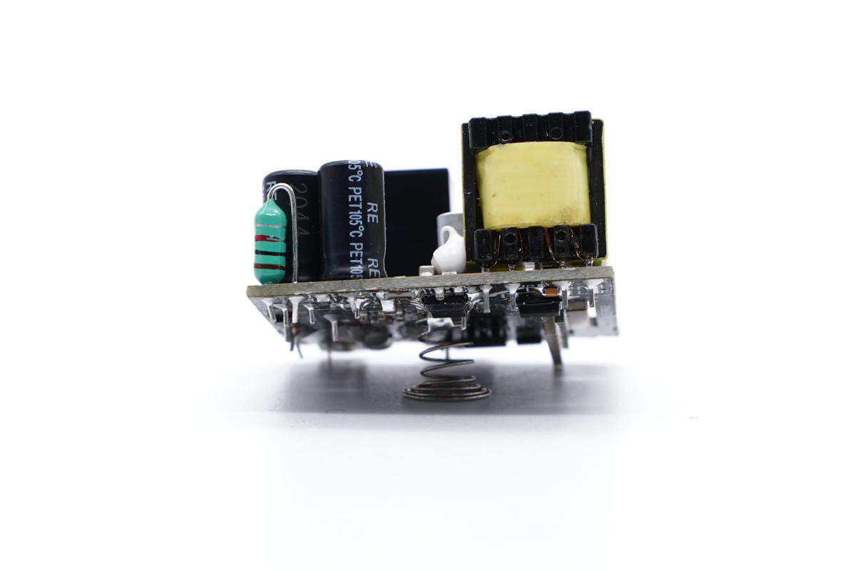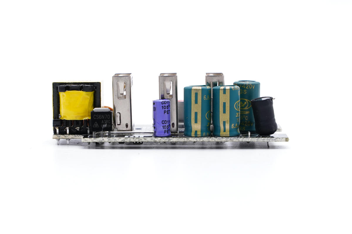 PCB板側(cè)面一覽,有兩顆高壓濾波電解電容、主控芯片供電電容和初級(jí)開關(guān)管。