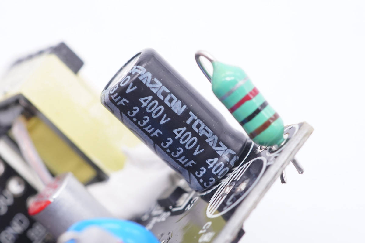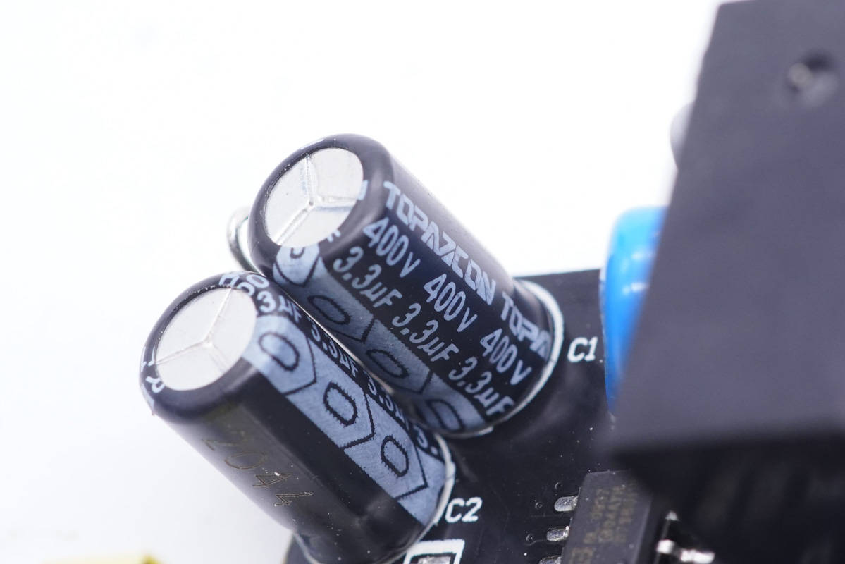 兩顆濾波電解電容為TOPAZCON品牌。規(guī)格都是400V 3.3μF。
