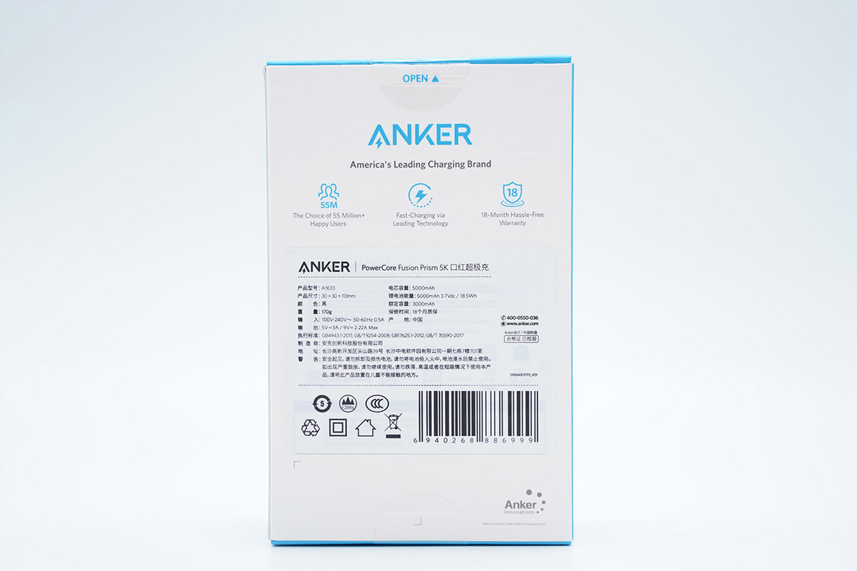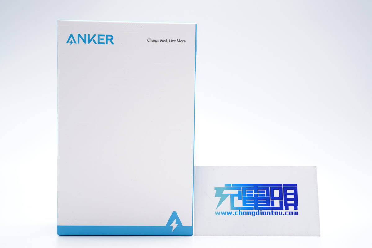 產品包裝盒是熟悉的藍白配色,正面印有ANKER品牌logo。