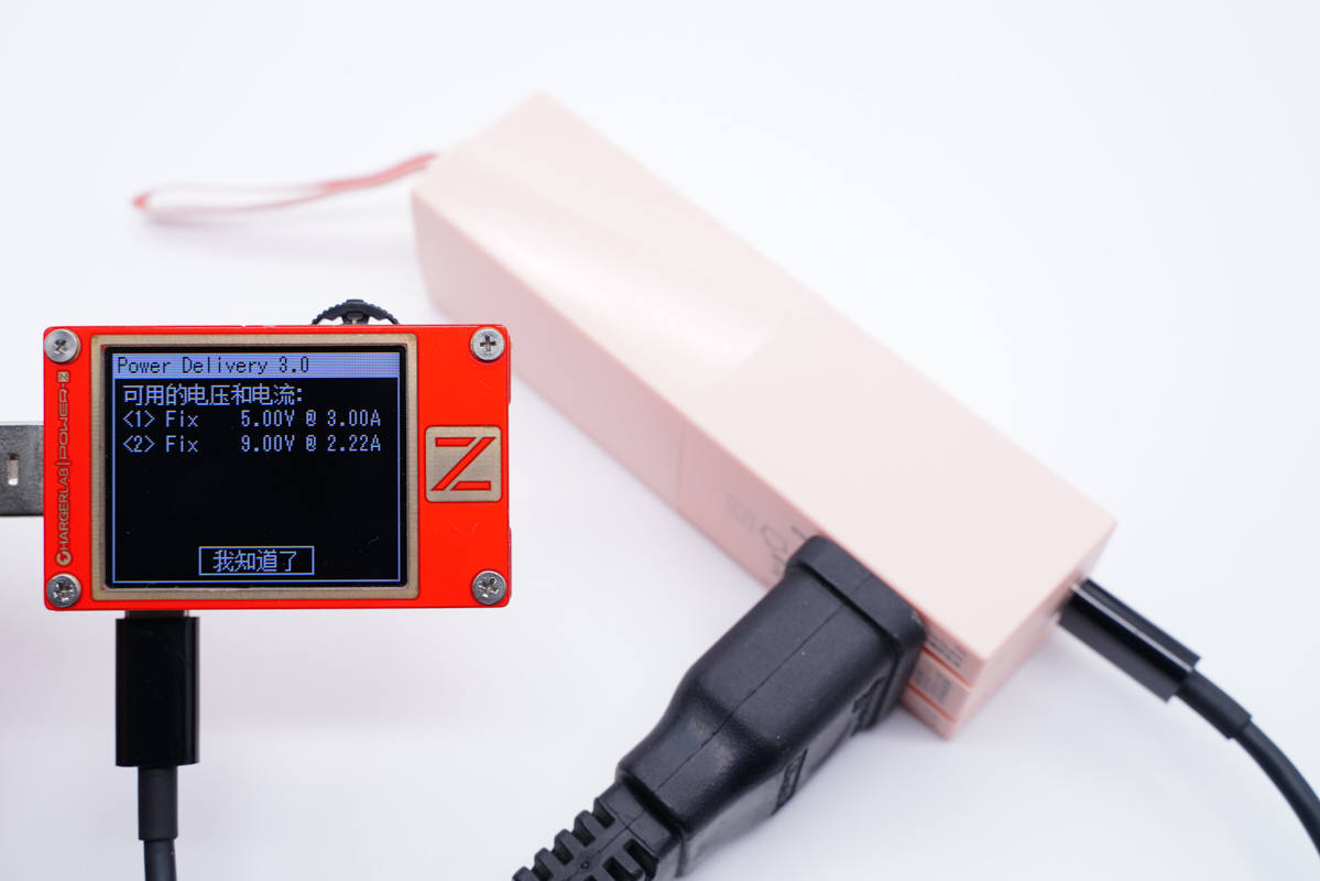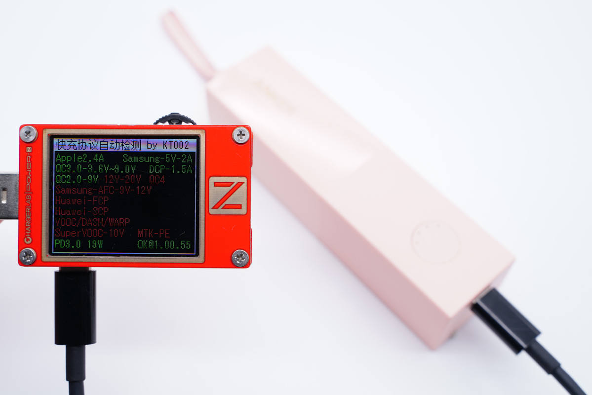 充電器模式下,使用ChargerLAB POWER-Z KT002檢測USB-C口輸出協議,顯示支持Apple 2.4A、Samsung 5V2A、DCP協議,以及QC2.0/3.0、PD3.0快充協議。