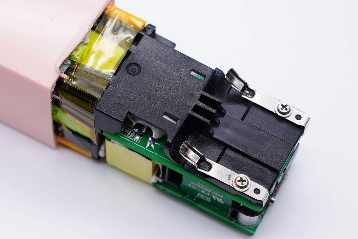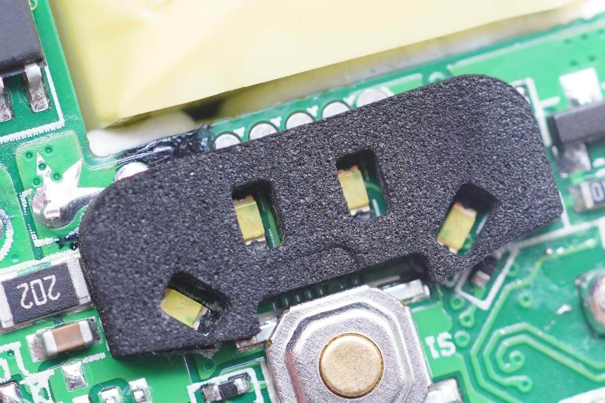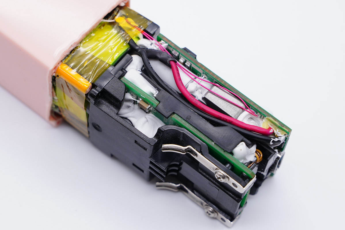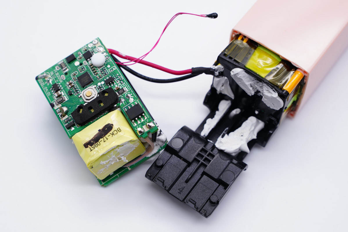 充電頭網通過拆解了解到,產品內部對于磨砂和亮面兩部分區域分別裝充電器模塊和電池。充電器模塊由兩塊開關電源小板和一塊移動電源小板,共計三塊小板組合而成,之間設有隔離板,同時打膠處理,保證絕緣以及整個模塊的穩定性。