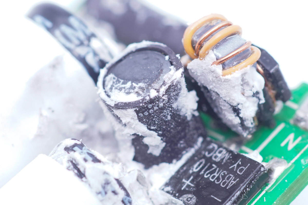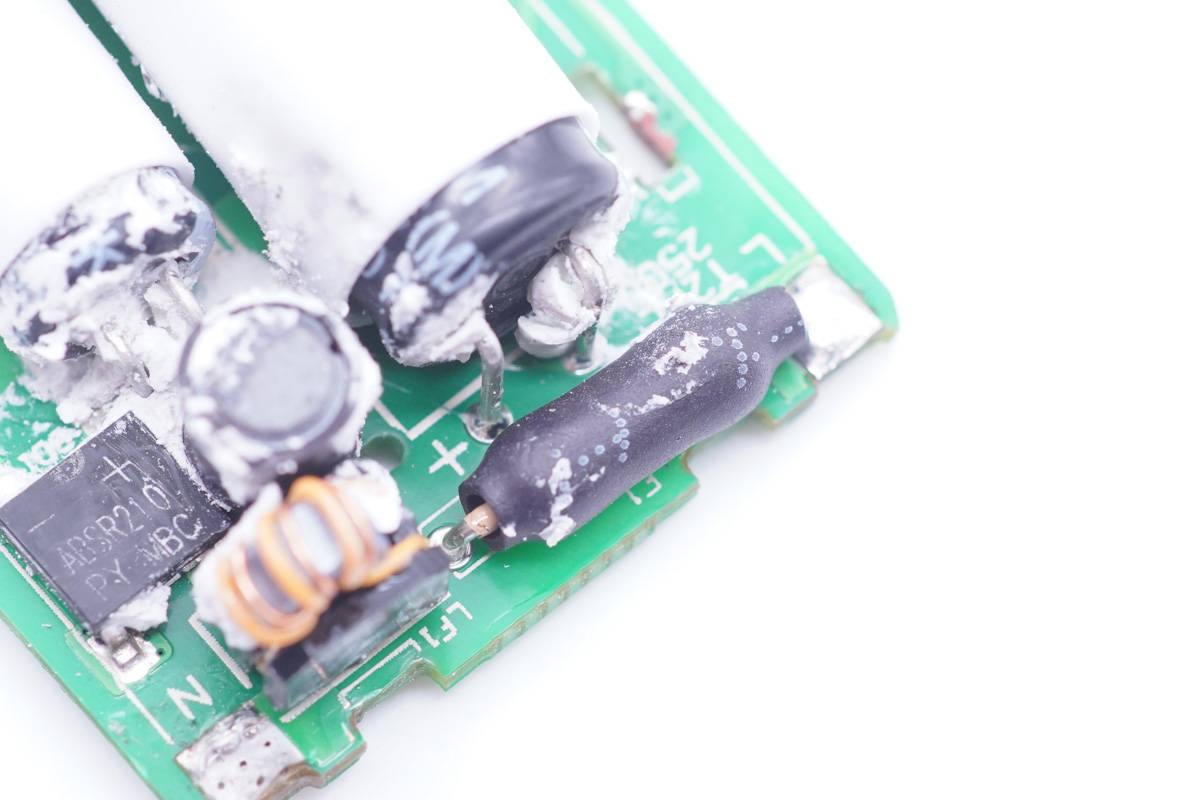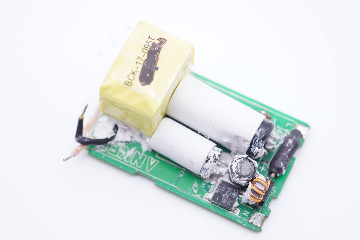 充電器小板正面一覽,兩顆高壓濾波電解電容外套白色絕緣膠套并橫置。