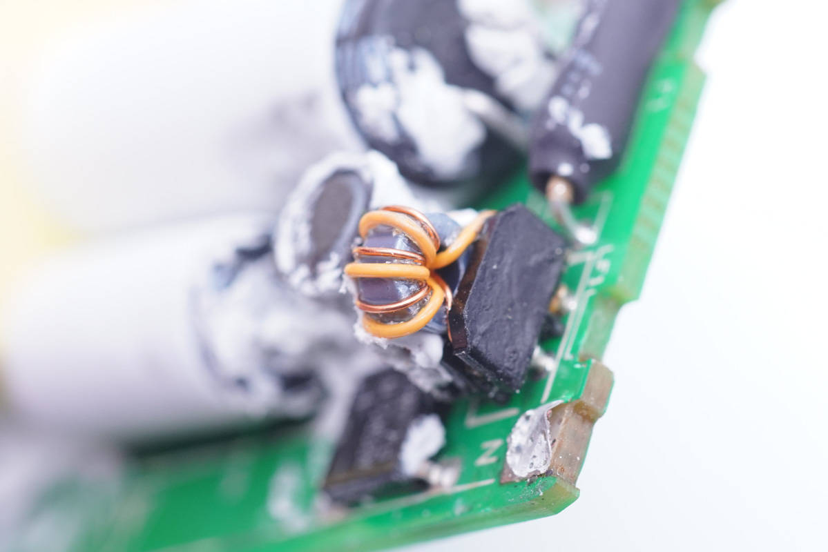 工字電感特寫,外套熱縮管保護。