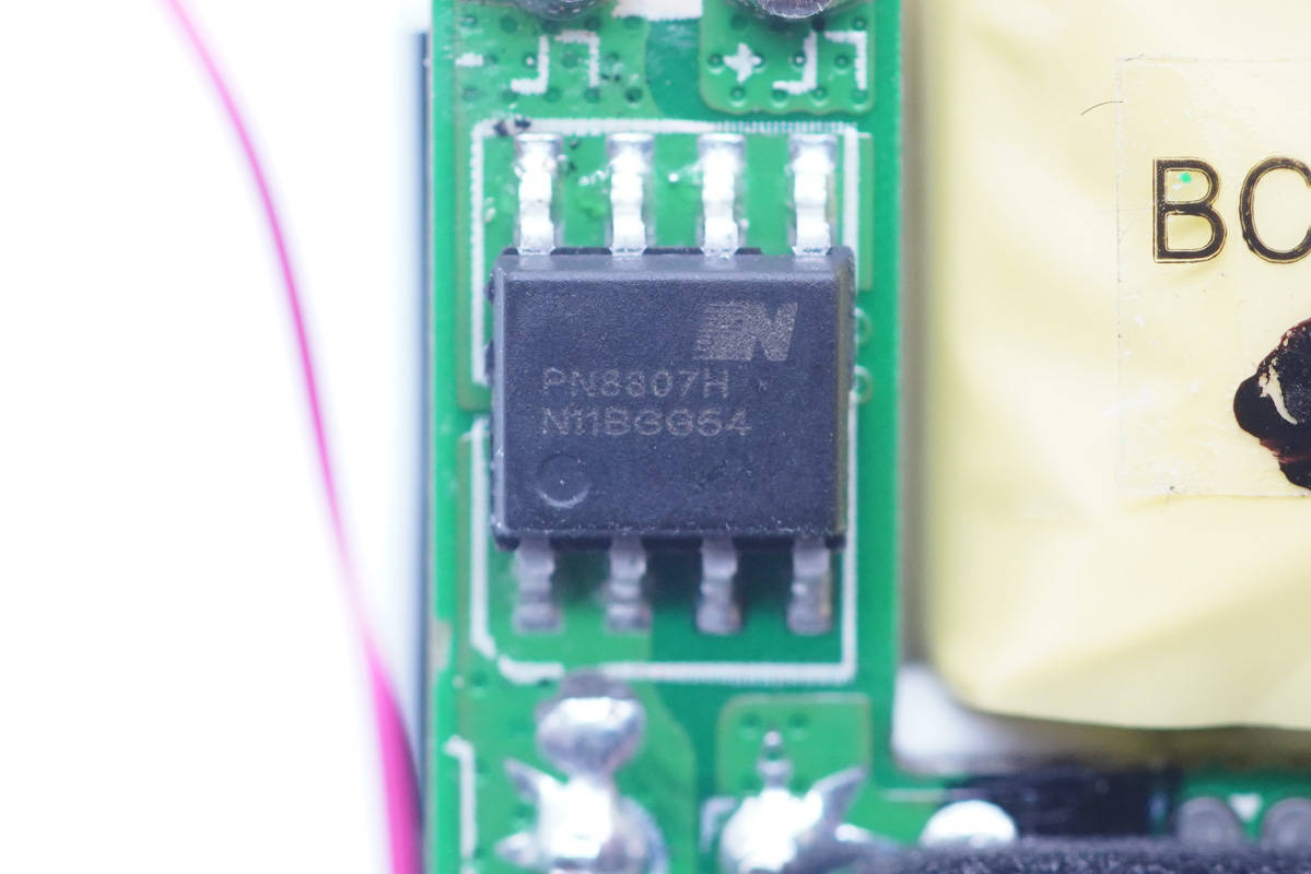 和PWM主控芯片搭配的是芯朋微PN8307H次級同步整流芯片。PN8307H內置同步整流控制器及高雪崩能力功率MOSFET,用于在高性能AC/DC反激系統中替代次級整流肖特基二極管,導通壓降極低的功率MOSFET可以提高電流輸出能力,降低溫升,提升轉換效率,使得系統效率可以滿足6級能效的標準,并留有足夠的裕量。