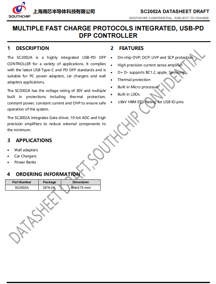 南芯SC2002A是一款高度集成的PD DFP控制器。它符合最新的USB Type-C和PD 3.0標準,并支持最流行的高壓快速充電協議(包括華為SCP和VOOC閃充),最多支持2組DPDM接口,可以單芯片支持1C1A應用,廣泛應用于墻充,車充和支持USB快充的插線板。