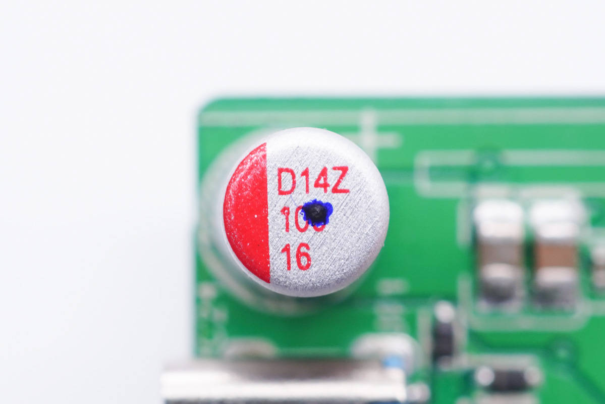 輸出濾波固態電容特寫,規格為16V 100μF。