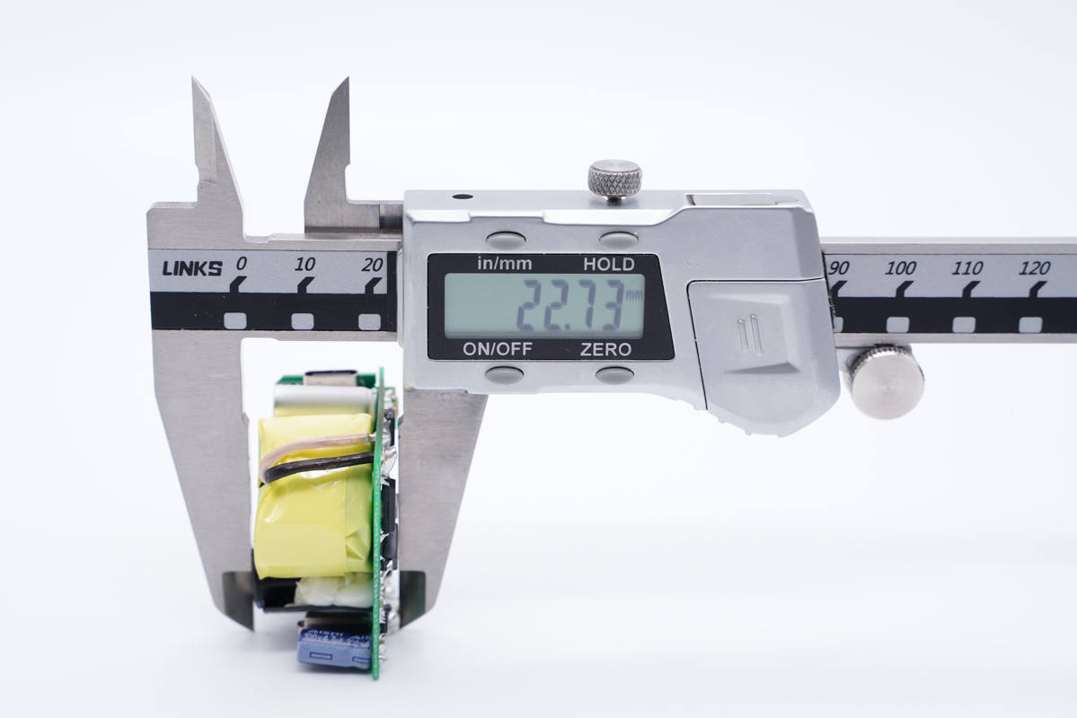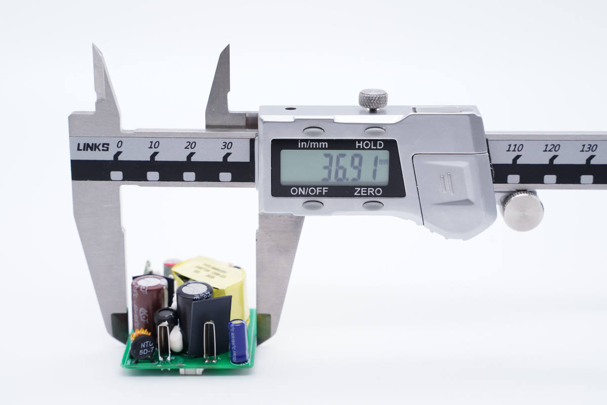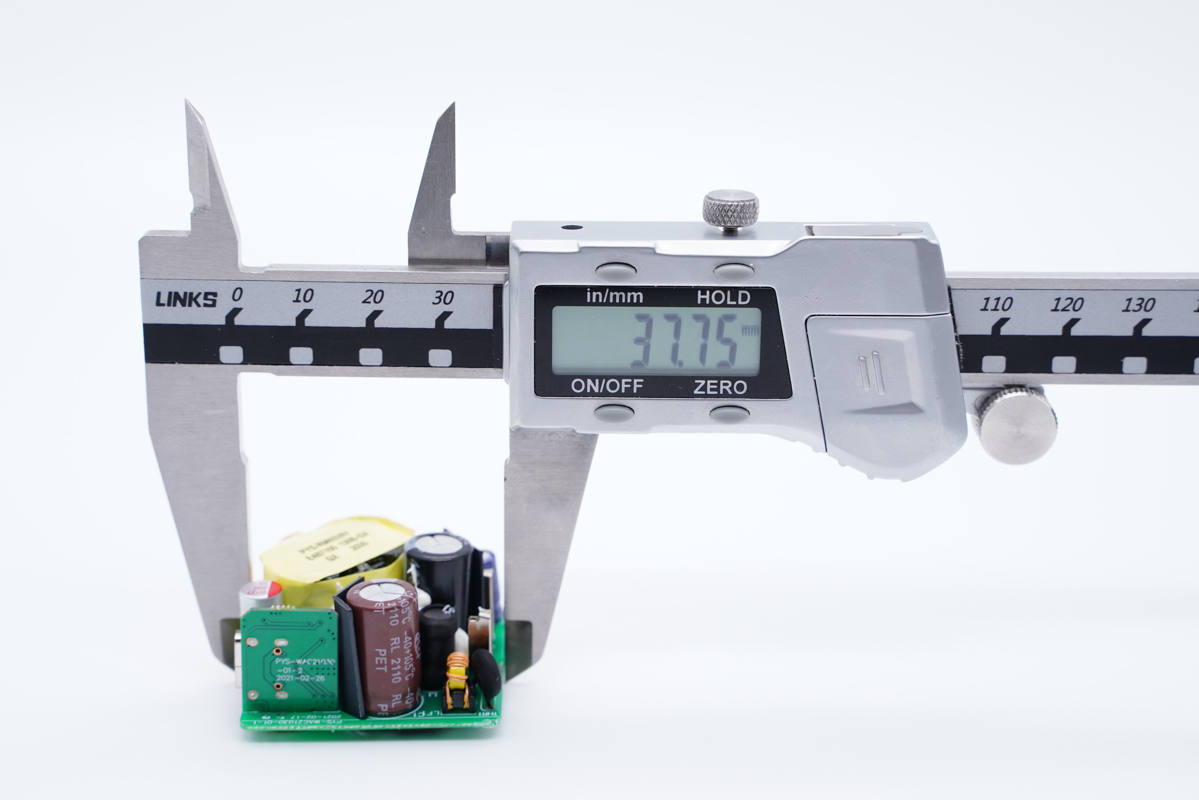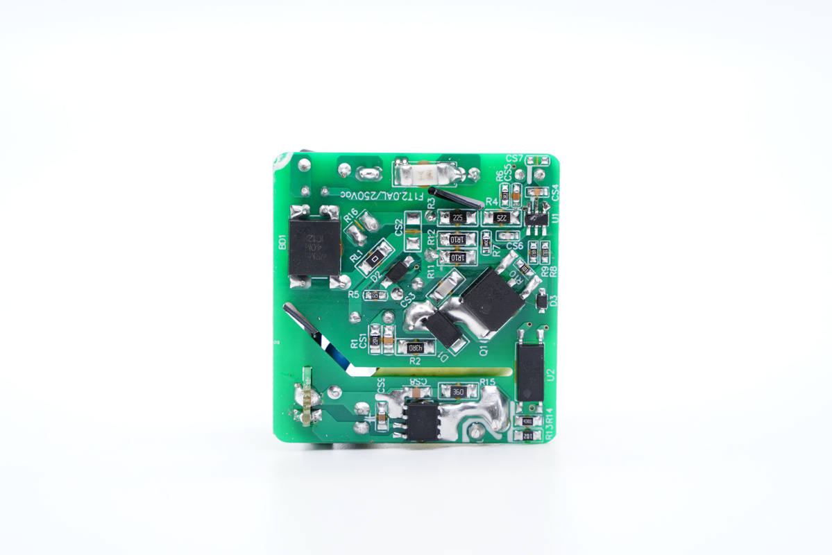 主板背面一覽,初級側設有貼片保險絲、整流橋、PWM控制器和初級開關管,次級側設有一顆同步整流芯片,初級次級間鏤空隔離。