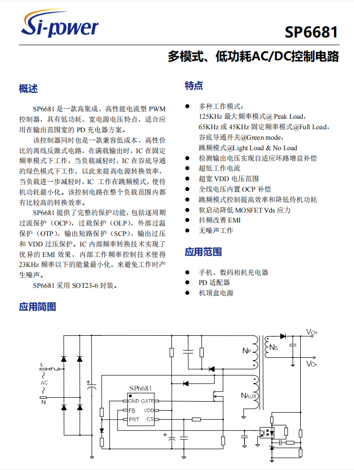 無錫硅動力SP6681是一款高集成、高性能電流型PWM控制器,具有低功耗、寬電源電壓特點,適合應用在輸出范圍寬的PD充電器方案。 該控制器同時也是一款兼容低成本、高性價比的離線反激式電路,該控制電路在整個負載范圍內都有比較高的轉換效率。