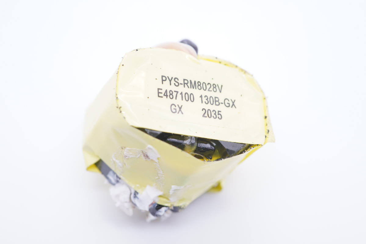 主板另一側是主控芯片供電電容和變壓器,變壓器使用絕緣膠帶嚴密包裹。