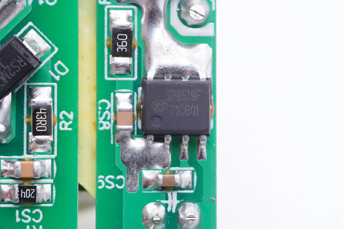 充電頭網通過拆解了解到,充電器輸入端是金屬片接觸式通電設計,PCB板上電容、變壓器等器件打膠加固,電容還做了絕緣隔離處理。充電器采用了硅動力SP6519F高性能同步整流芯片,云矽半導體XPD737認證協議芯片,方案簡潔。此外還采用了艾華品牌電解電容進行濾波。