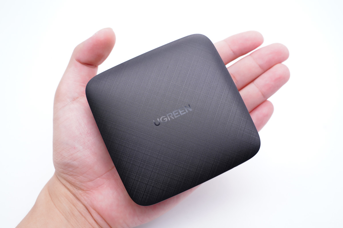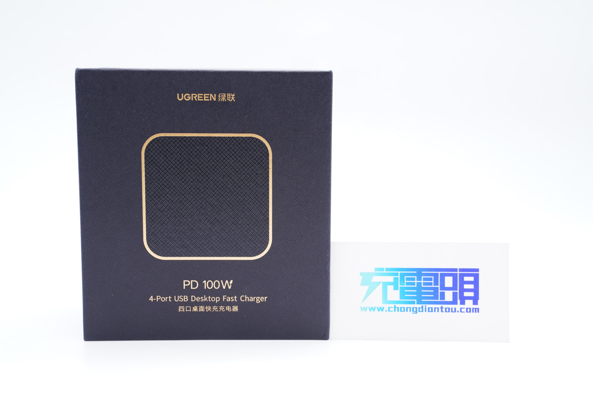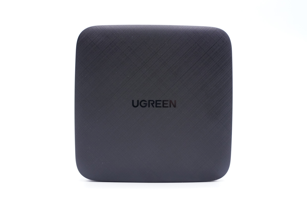 UGREEN綠聯的這款100W四口桌面快充充電器整體采用方正的造型設計,頂部伴有微微的弧度設計,熟悉的交叉紋理覆蓋在上面,正中間凹印著UGREEN的品牌Logo。