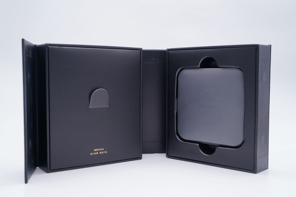 產品包裝盒的正面采用黑金的外觀設計,勾勒出了產品的輪廓,上面是“UGREEN綠聯”的品牌Logo,下面是這款產品的名稱。