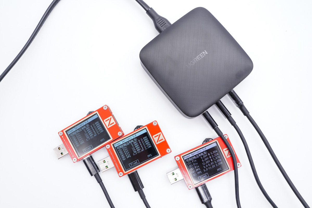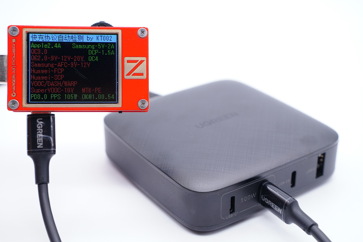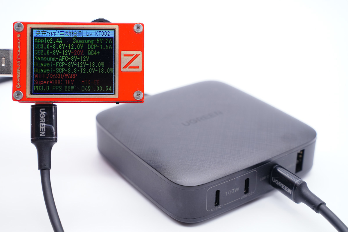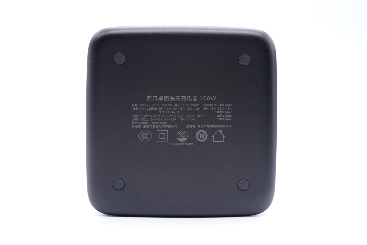 UGREEN綠聯100W桌面快充充電器配備了3C1A共4個USB接口,支持常見的絕大部分快充協議,C1和C2支持100W功率盲插,3.3-21V 5A寬電壓范圍的PPS加持使得其在為黑鯊4 Pro和努比亞Z30 Pro等機型充電時功率可以達到百瓦級別。C3和A口為同一路輸出設計,單獨使用支持20W和18W輸出功率,同時輸出調整為10.5W+10.5W。關于多口同時輸出在文章中也有詳細的測試,感興趣的可以向上翻看。