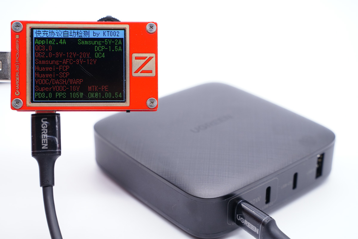 使用ChargerLAB的POWER-Z KT002讀取USB-C1的快充協議,USB-C1支持PD、PPS、Apple2.4A、QC4快充協議。