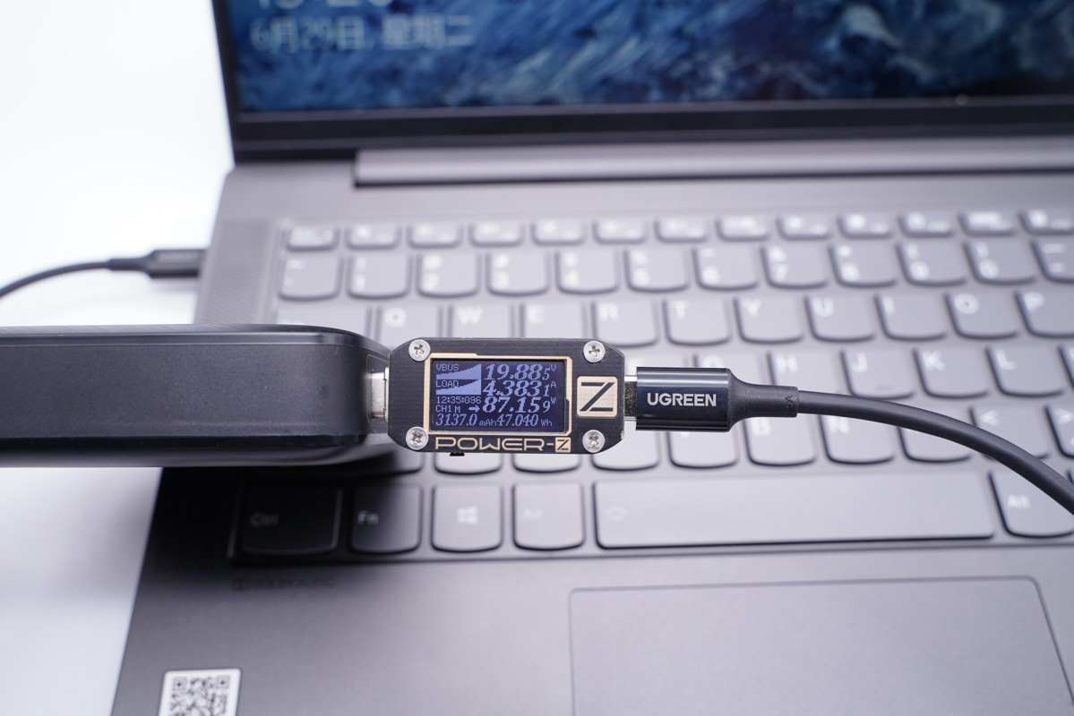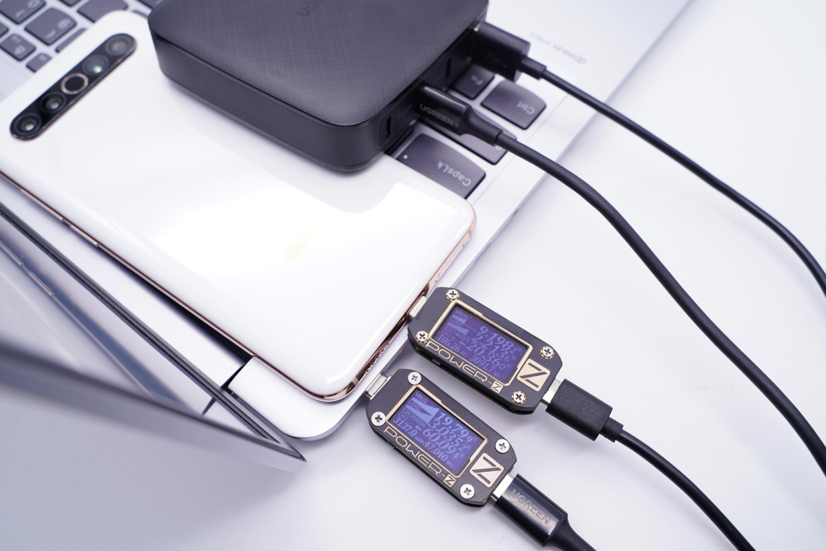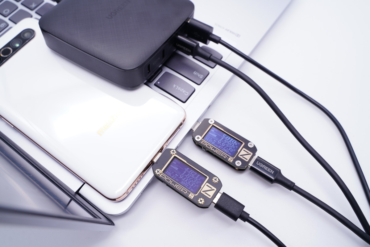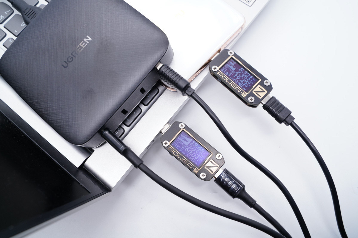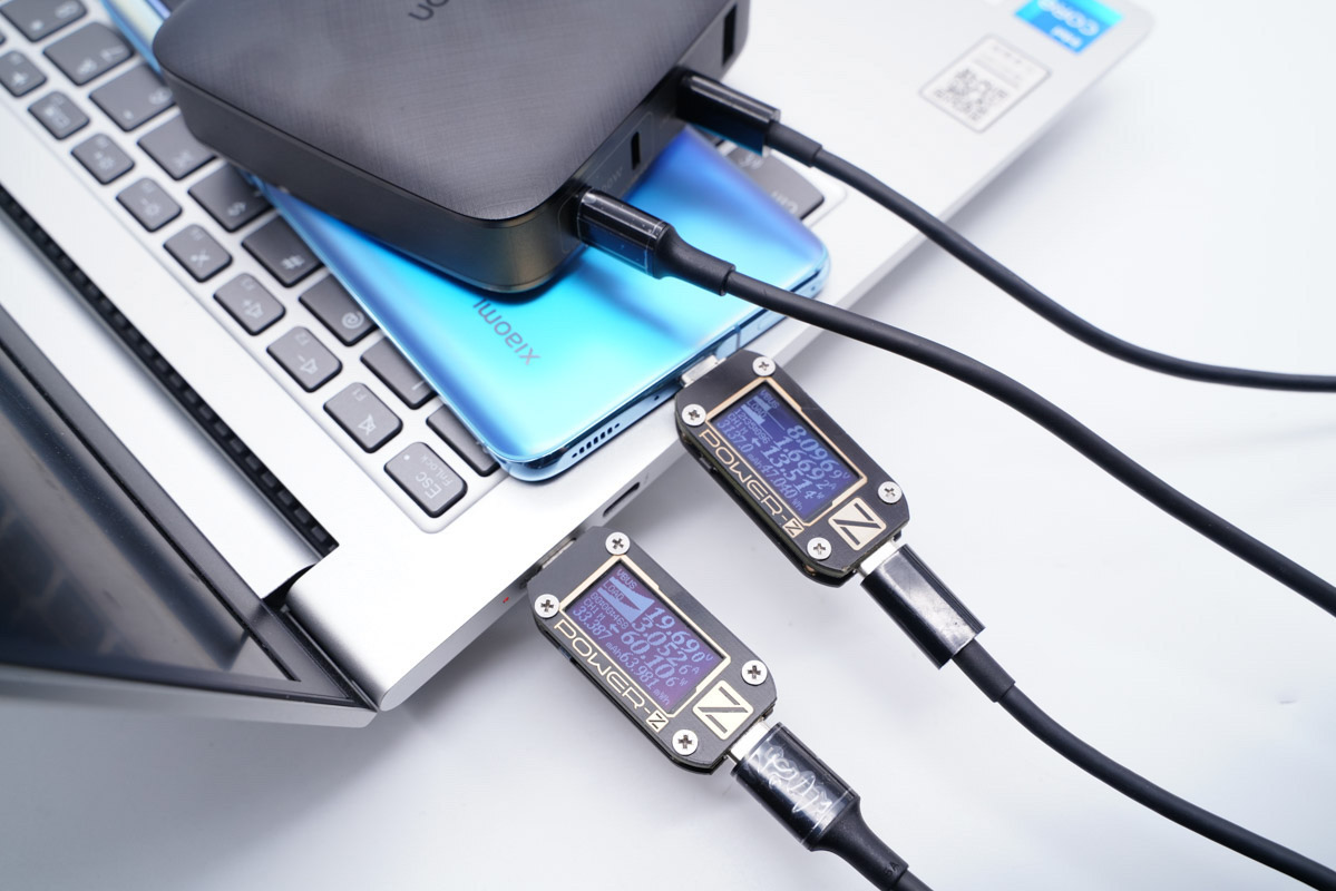 使用C2為筆記本充電,功率為60.09W;同時使用USB-A為手機充電,功率為20.36W,充電器支持C2和A口同時輸出且均處于快充狀態。