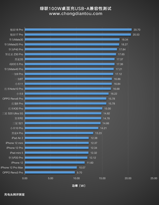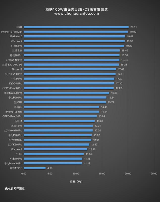 USB-C3支持20W快充,所以柱狀圖的差距較小,一加8T的功率最高,為20.11W,其他大部分設備都處于支持快充狀態。