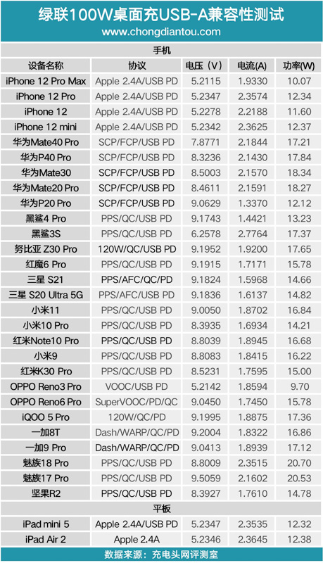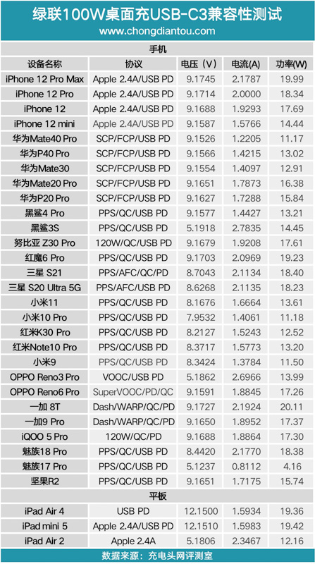 USB-C1的測試數據匯總,得益于3.3-21V寬范圍的PPS快充加持,USB-C1為部分手機充電功率可以達到近百瓦級別,表現不錯,只是對紅魔6 Pro的兼容性一般。