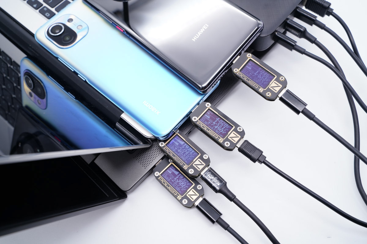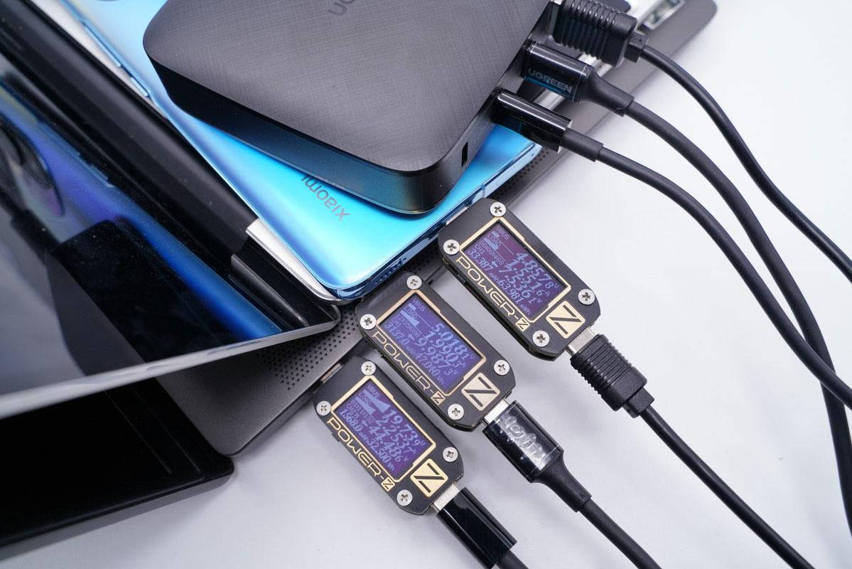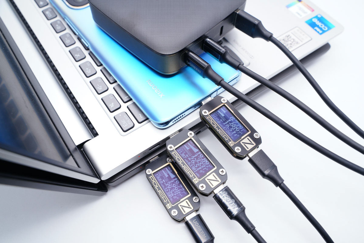 使用C1為筆記本充電,C2為筆記本充電、A口為手機充電,C1功率為39.52W、C2功率為26.51W、C3功率為16.51W。