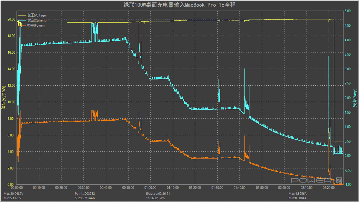 使用USB-C1為MacBook Pro 16充電,連接充電器之后功率開始上升,約49分鐘前處于平穩輸入狀態,功率在78W左右。隨后功率和電流開始呈階梯式的下降狀態直至充電結束,全程耗時約2小時22分,最高功率為19.51V 4.59A 89.69W。