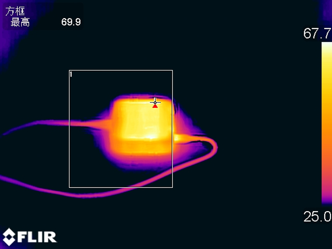 讓充電器以20V5A 100W的功率持續滿載輸出1小時后采集到充電器表面最高溫度為69.9℃。
