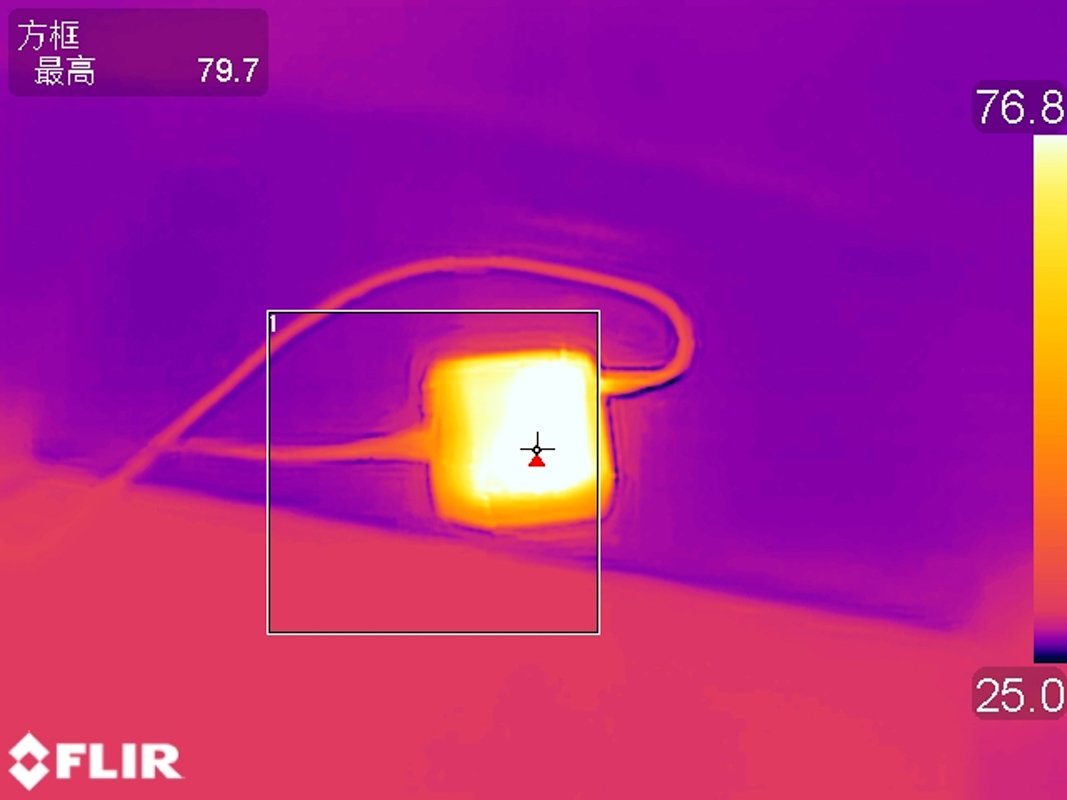 翻轉至另一側,充電器表面的最高溫度為79.7℃。