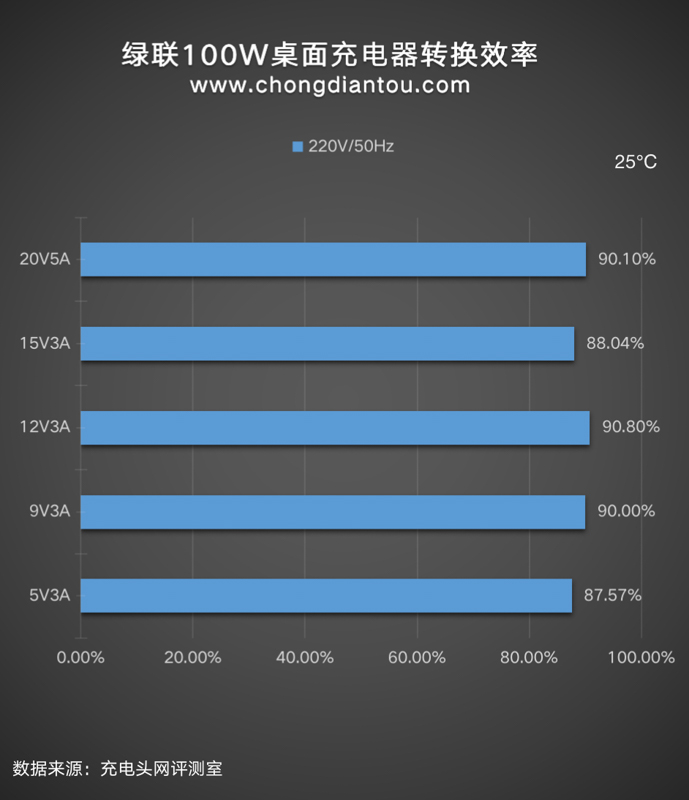 我們平時看充電器上面的參數輸出100W或者65W是充電器可以為設備提供的最大輸出功率,但充電器從插座上汲取的功率往往要更大一些,下面是UGREEN綠聯100W四口桌面快充充電器在220V 50Hz和110V 60Hz交流輸入的情況下分別進行了轉換效率測試,測試結果如下: