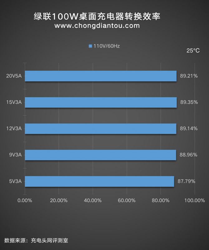 110V 60Hz下,充電器的轉換效率從87.79%到89.35%不等。